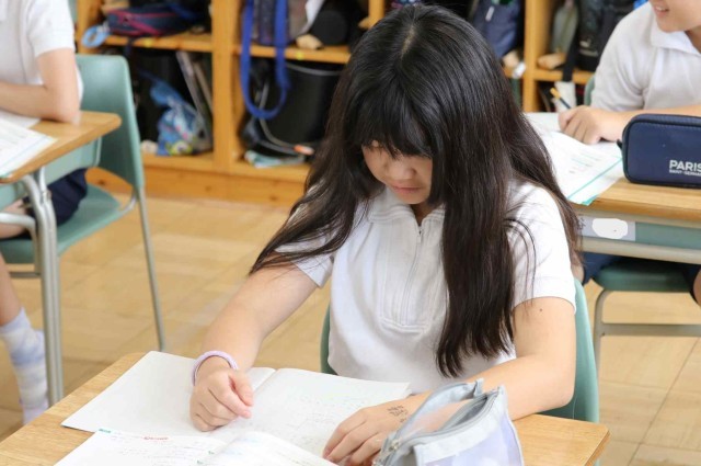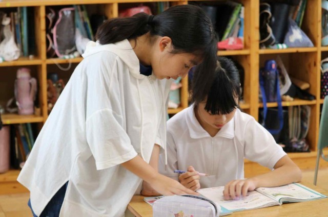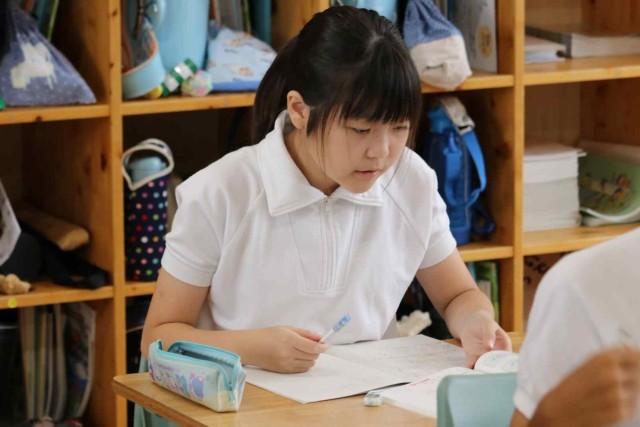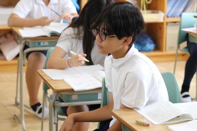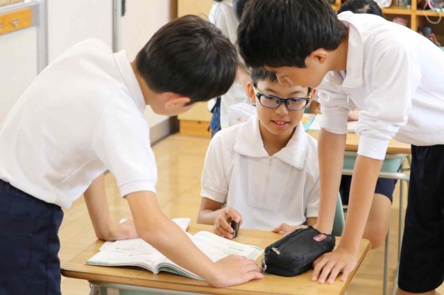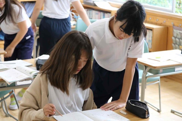 算数の授業で比の学習をしました。2つの数量の大きさを比を使って表すことができました。友達同士で教え合い、お互いの理解を深めていました。