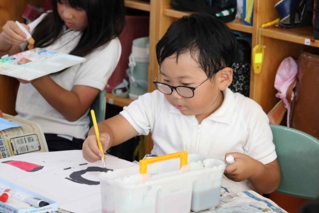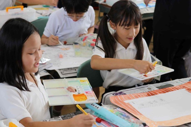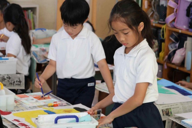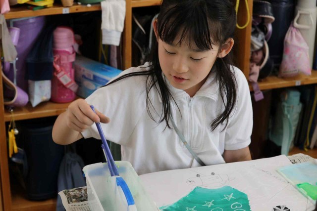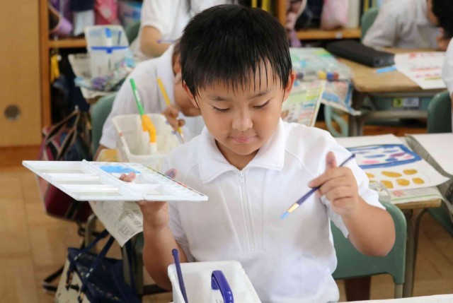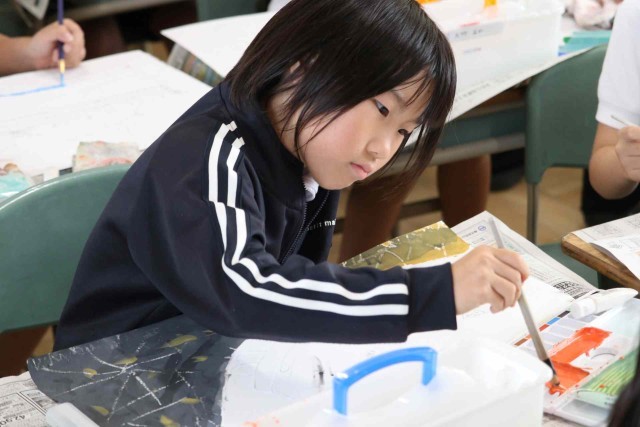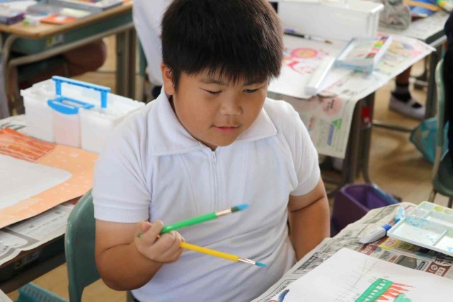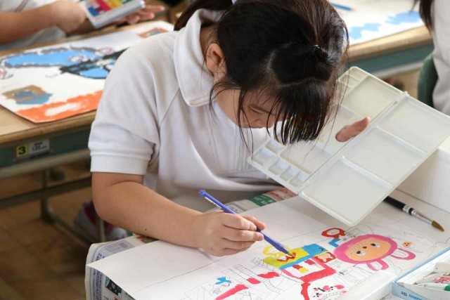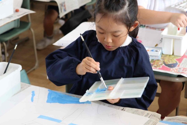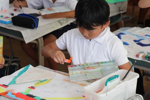 図工の授業で水彩の学習をしました。乗り物のイメージをふくらませ、色や形を自分好みに変えて表現しました。絵の具の使い方もみんな上手になりました。