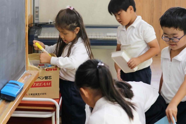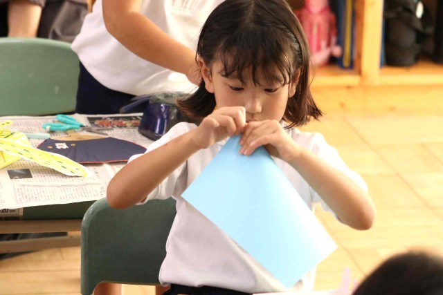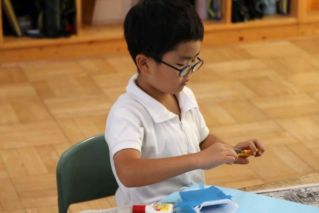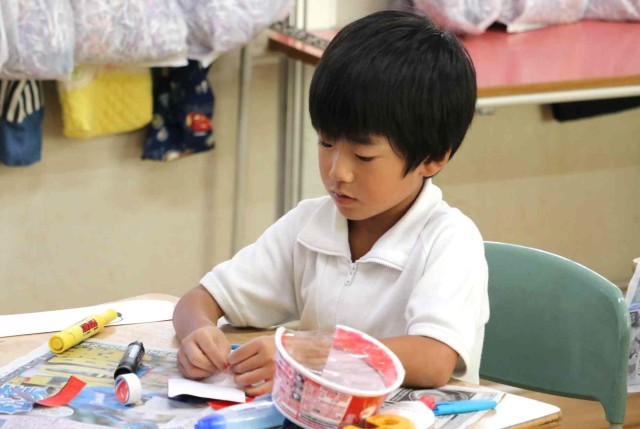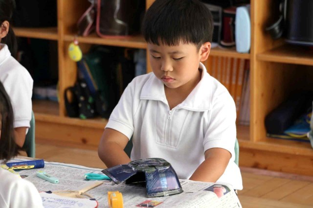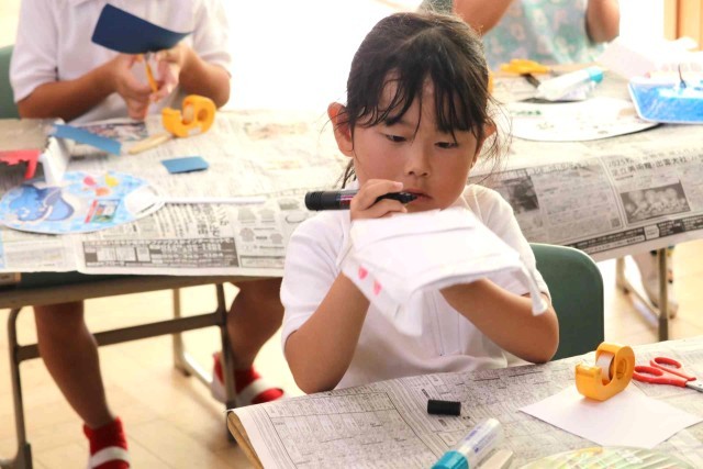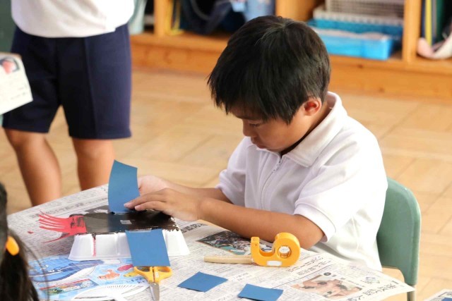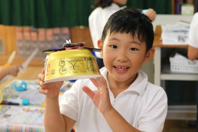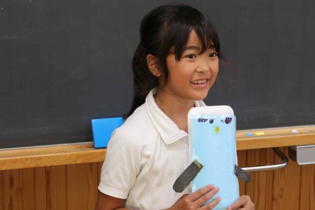 図工の授業で工作をしました。乗り物や動物などをイメージして、発泡スチロールを切ったり色を塗ったりしました。一人一人の個性が感じられる作品になっていました。