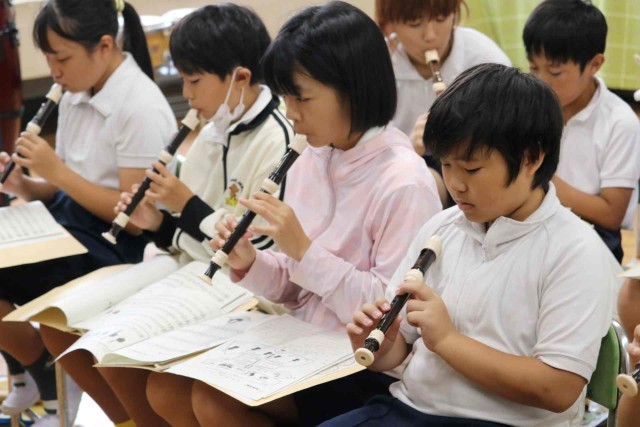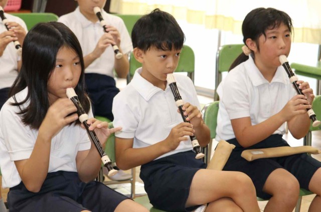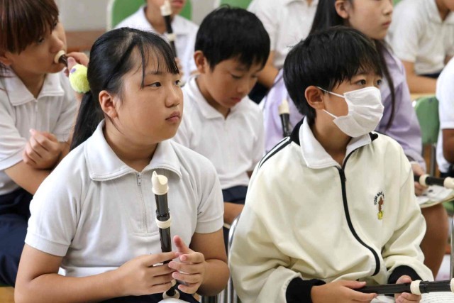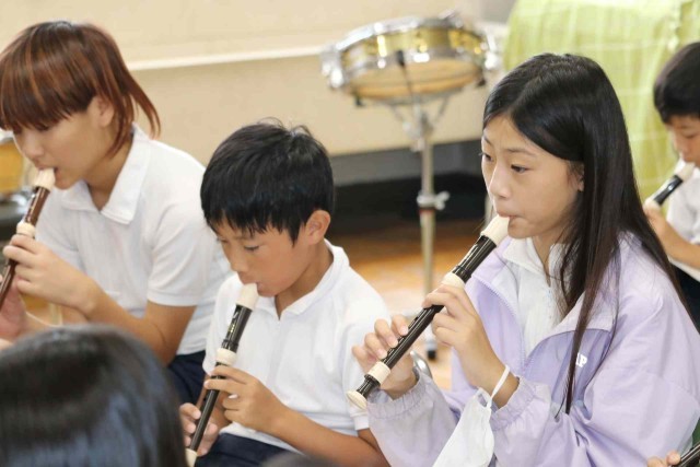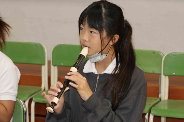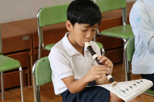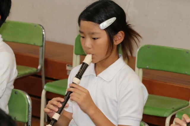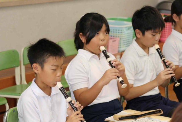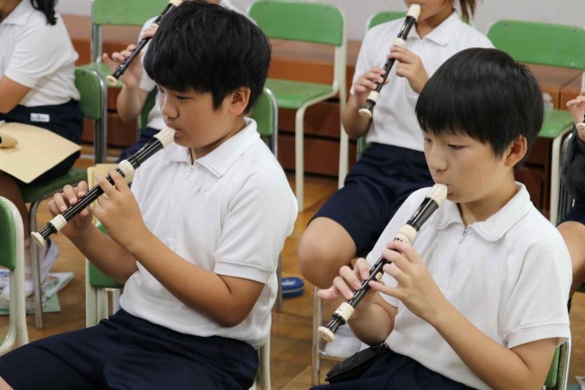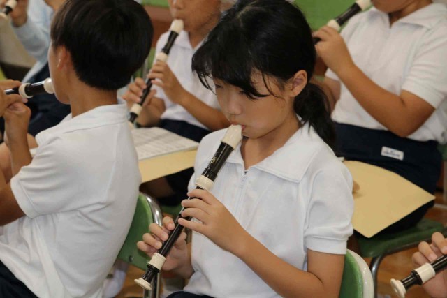 音楽の授業でリコーダーの学習をしました。先生が「ソのシャープ」と音階を言うと、正しい音色で吹くことができました。「マルセリーノの歌」を全員で演奏していました。
