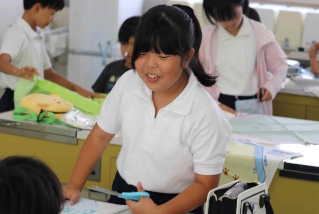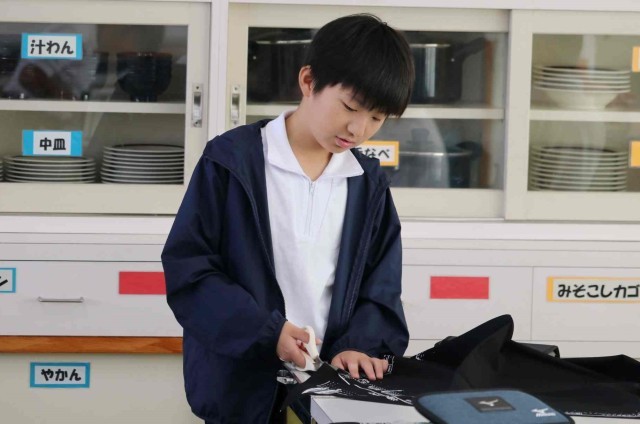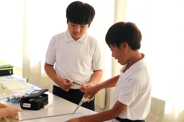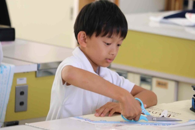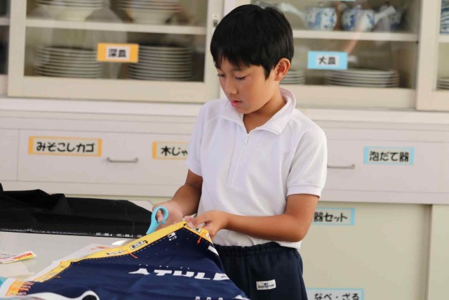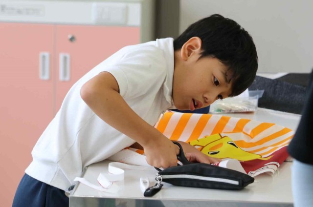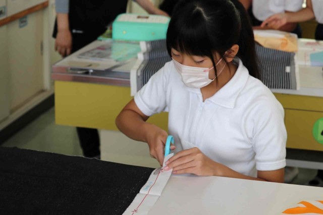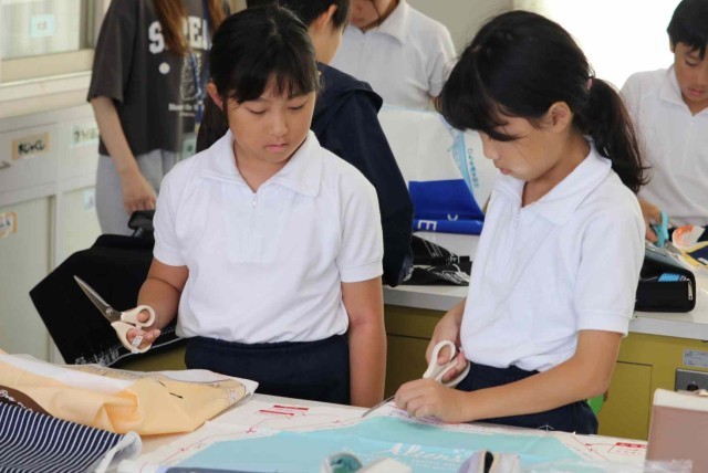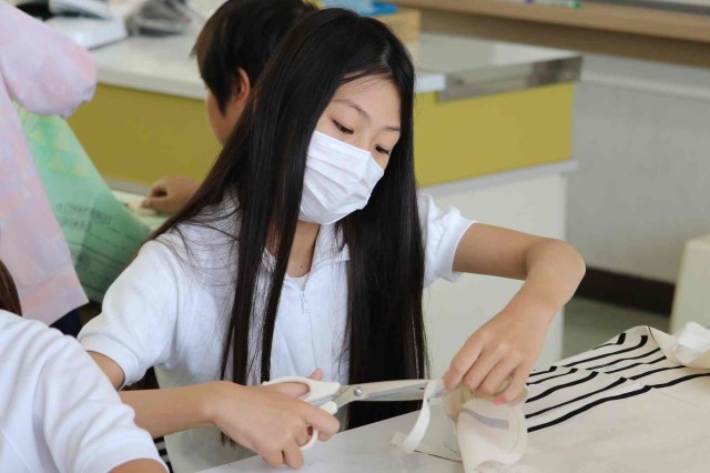 家庭科の授業でエプロンを作りました。自分が選んだ生地を、裁ちばさみで切り取っていました。失敗しないように慎重に作業を進めていました。切った後は、ミシンで縫っていきます。