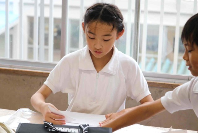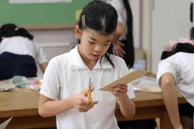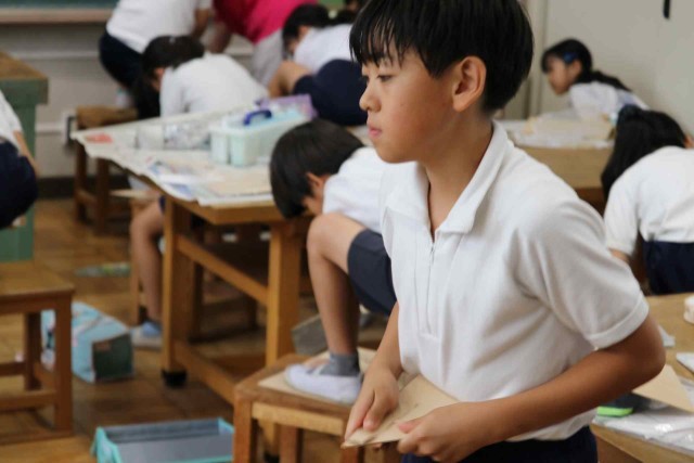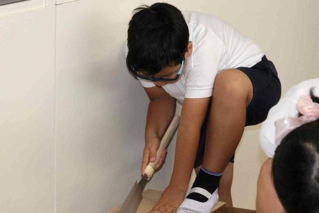 図工の授業で木工の学習をしました。木材に下絵を描いて、のこぎりで切り出していました。最初は恐る恐るのこぎりを引いていましたが、慣れてくると真っすぐ切ることができました。