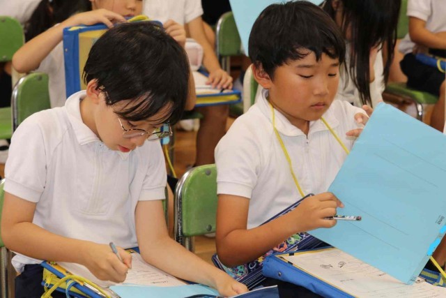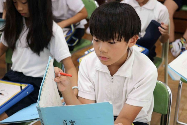音楽の授業で鑑賞の学習をしました。金管楽器がメインとなる「トランペットの休日」という曲を聞きました。聞きながら感じたことをプリントに記入していました。