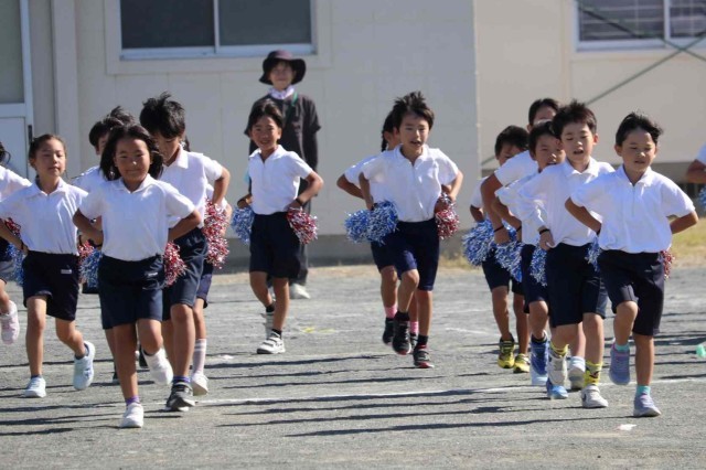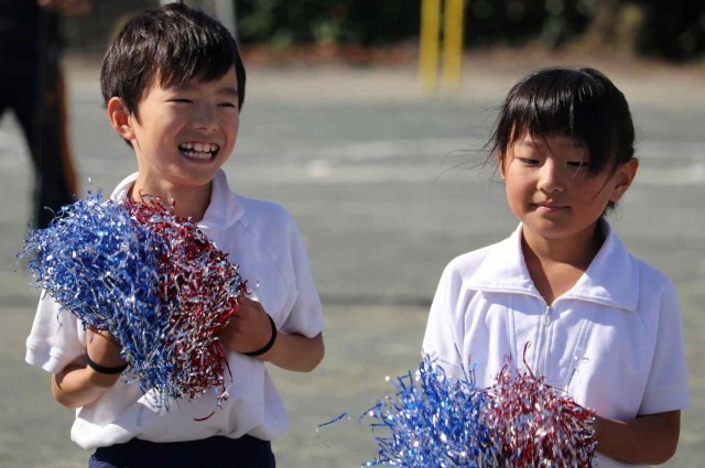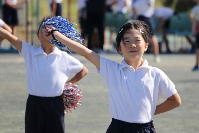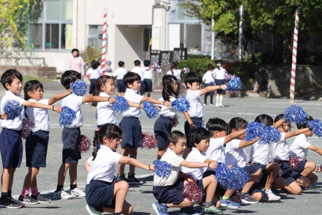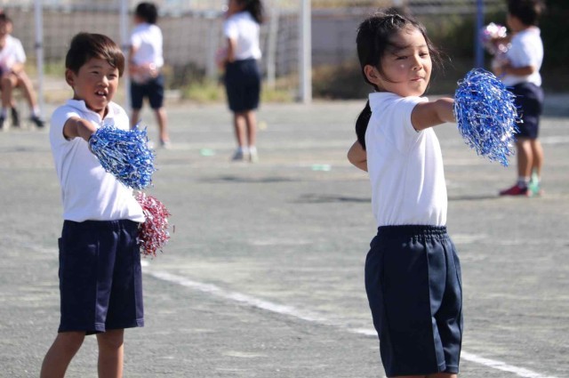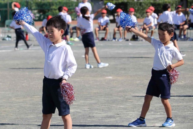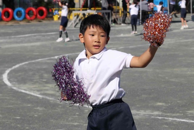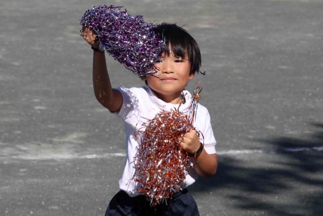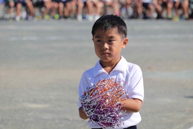 1,2年生が音遊をしました。きらきらしたボンボンを持って楽しそうに踊っていました。