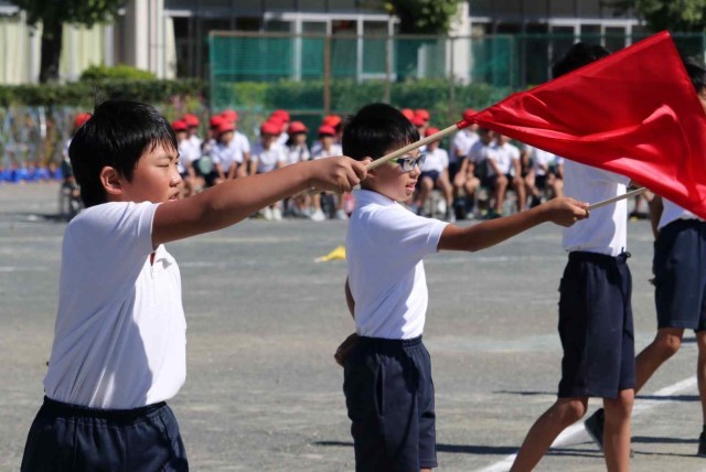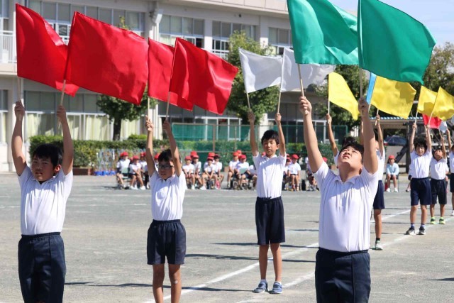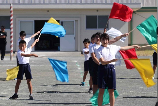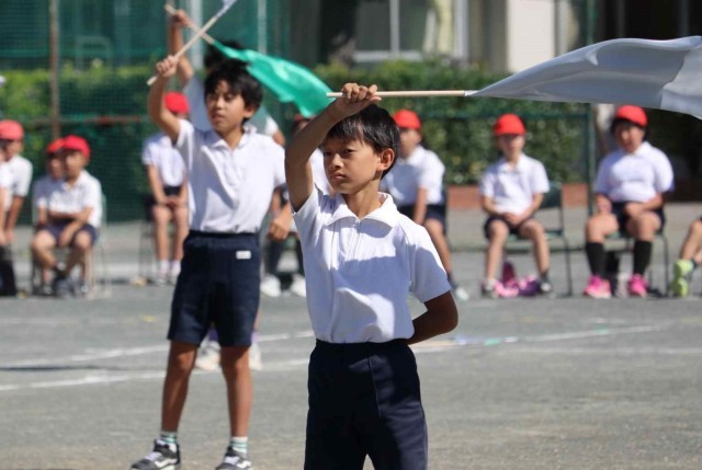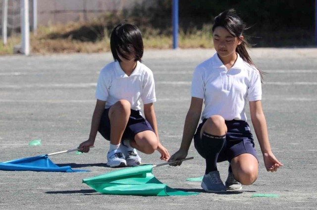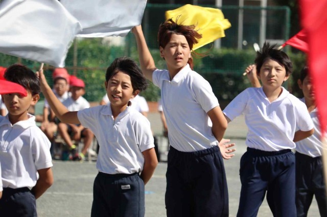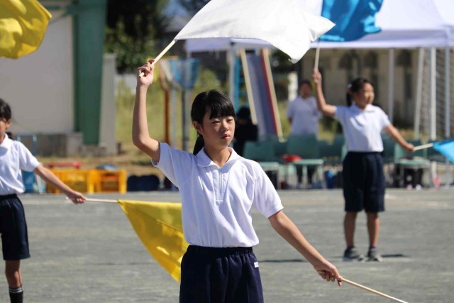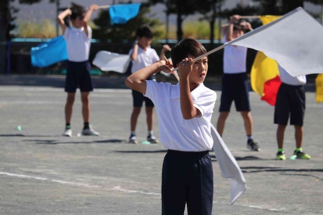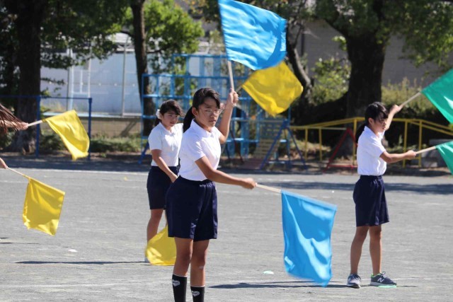 5,6年生がフラッグ演技をしました。青い空にフラッグがはためいていました。自信をもって踊れるようになってきました。