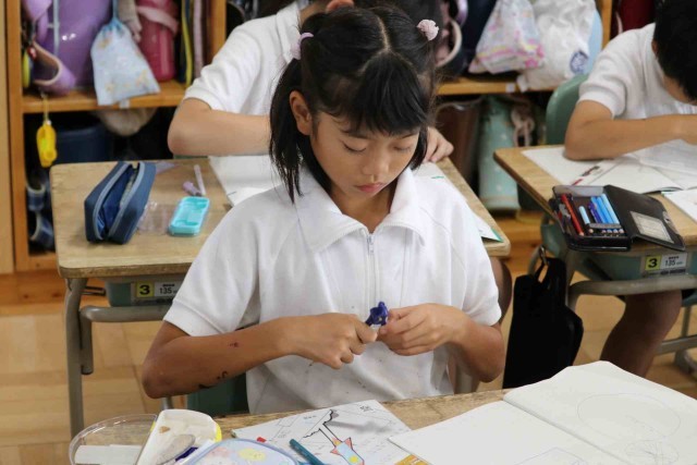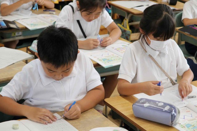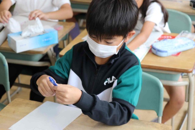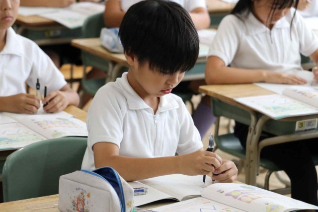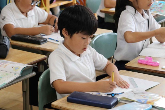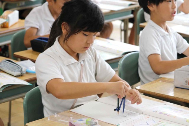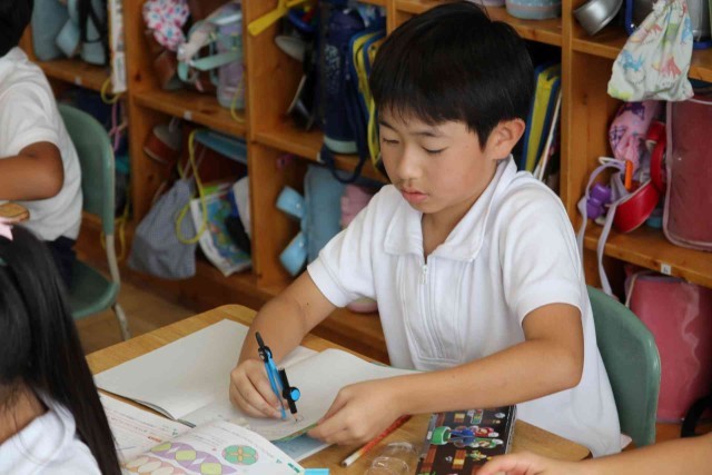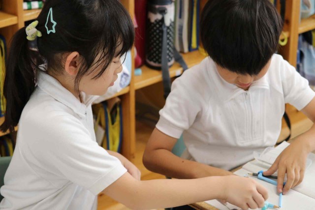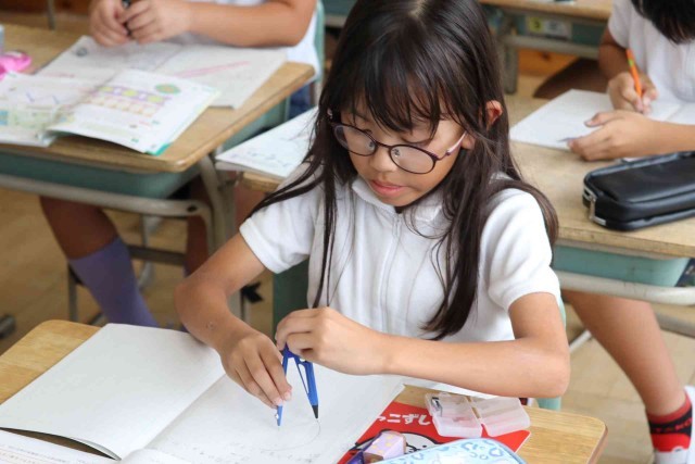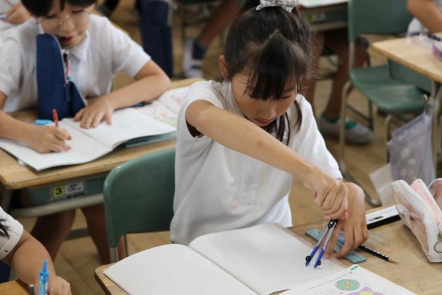算数の授業で図形の学習をしました。先生が「半径10cmの円と直径10cmの円を描きましょう。」と指示を出すと、コンパスを使って方眼ノートに円を描きました。少し大きくなったり小さくなったりしていました。