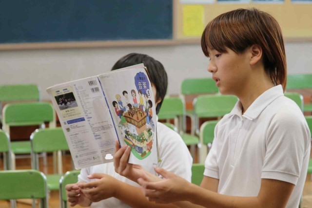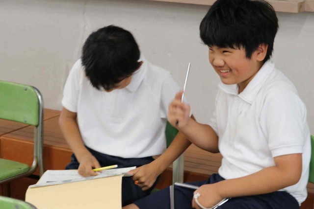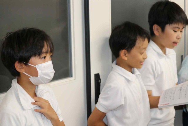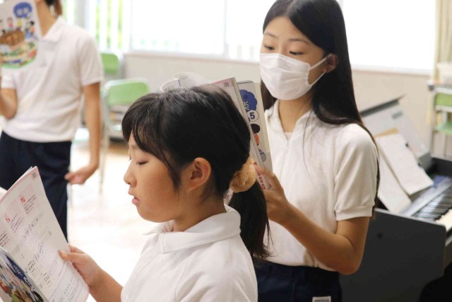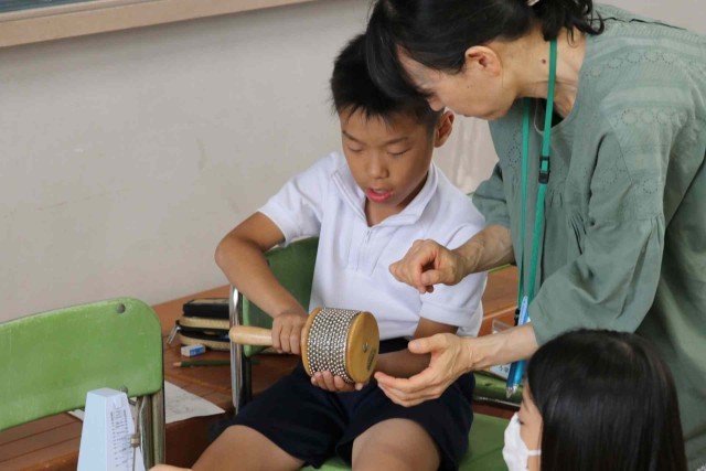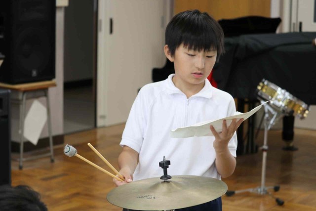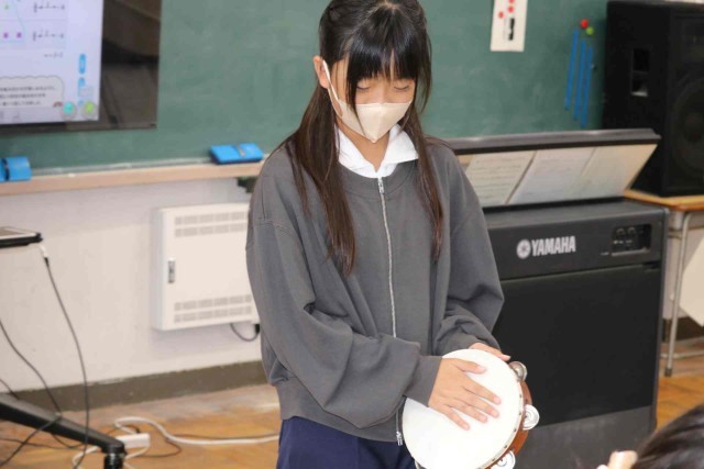 音楽の授業で打楽器による曲作りをしました。太鼓やシンバル、トライアングルなど、担当する楽器を決めて、友達と楽しそうに演奏していました。ピアノを囲んで合唱もしました。