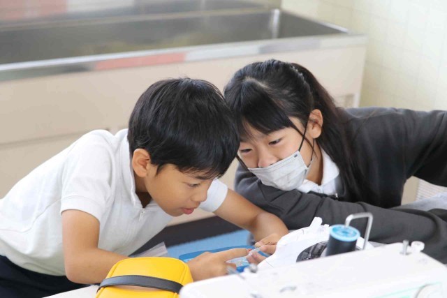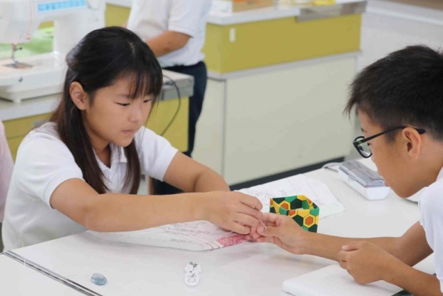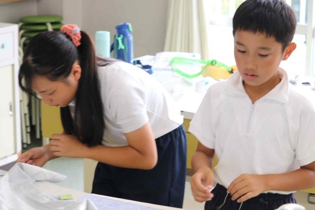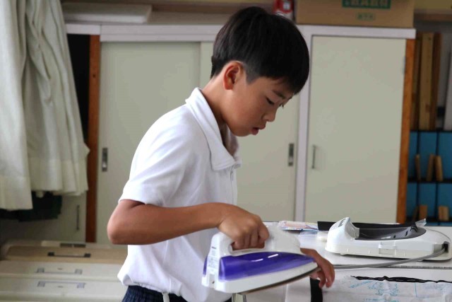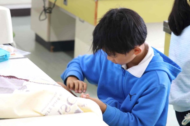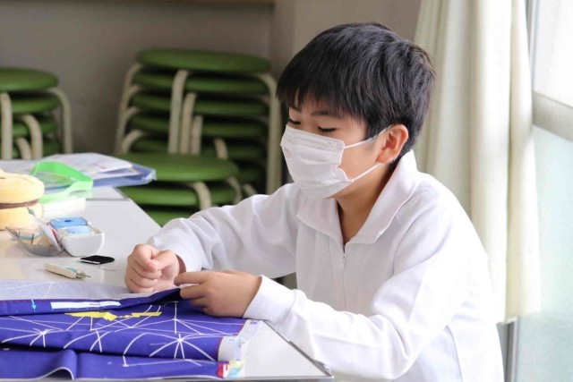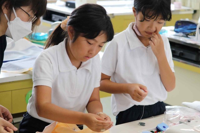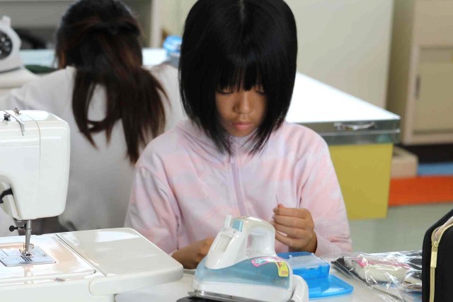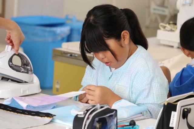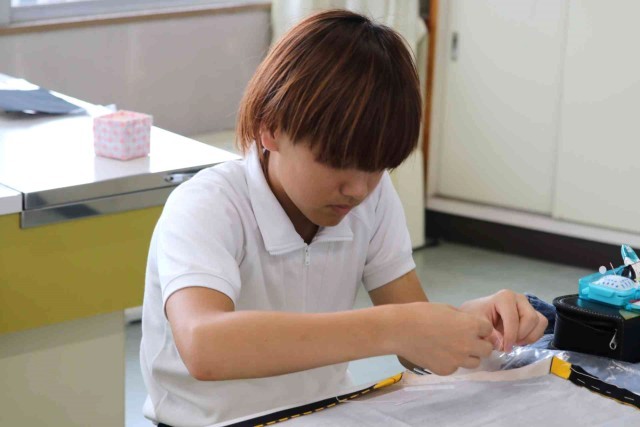 家庭科の授業でエプロンの製作をしました。アイロンをかけたり、手縫いをしたりと手際よく作業を進めることができました。少しずつエプロンの形が出来上がってきました。