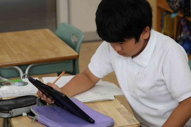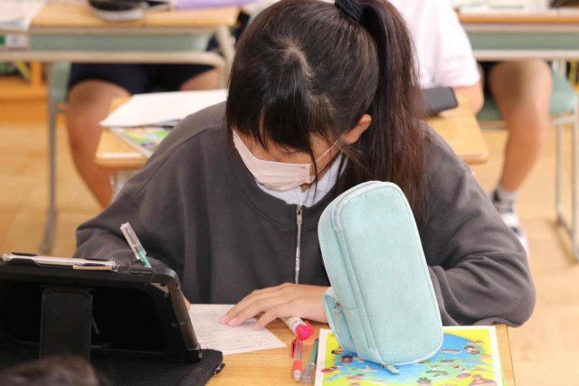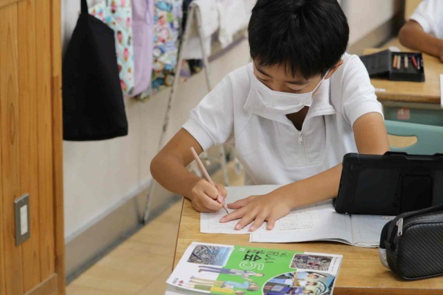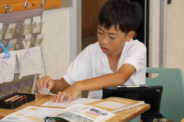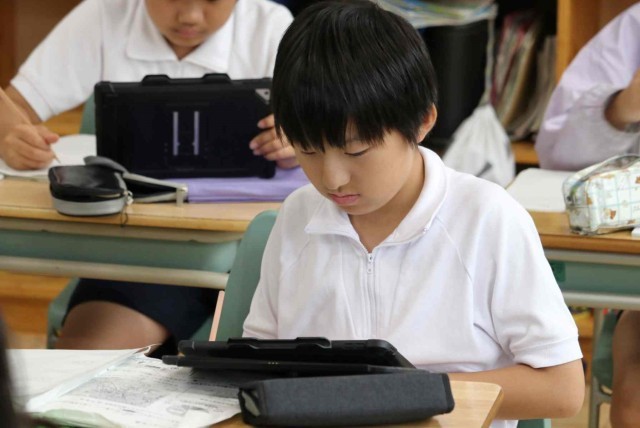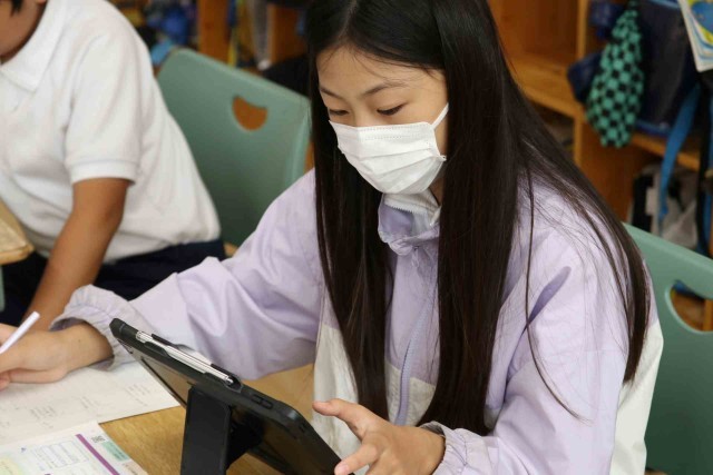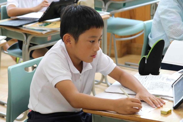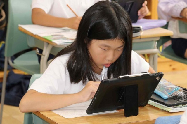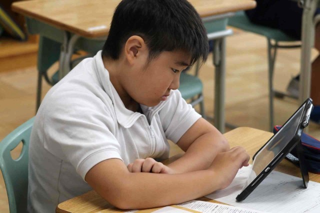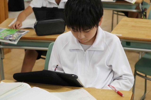社会の授業で自動車工場の仕事について学習しました。プレス、溶接、塗装、組立、検査といった工程をタブレットで動画視聴しました。たくさんのロボットが動いている様子に見入っていました。