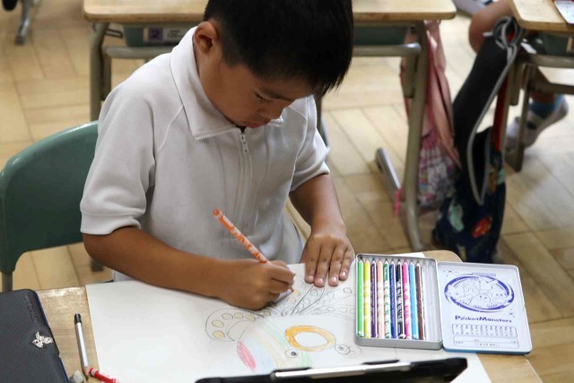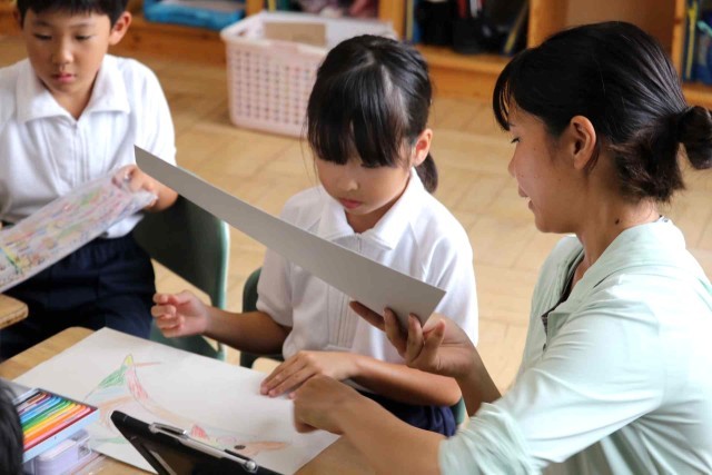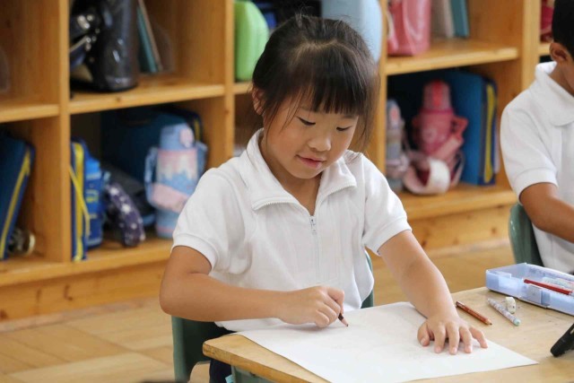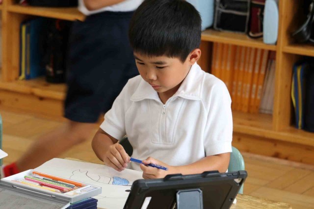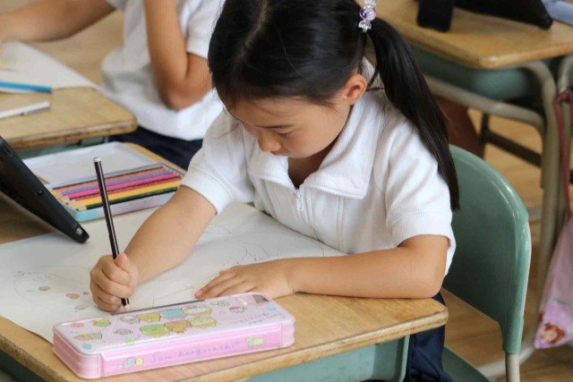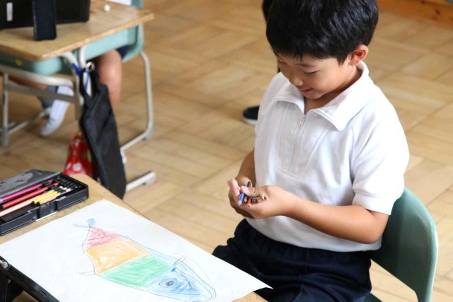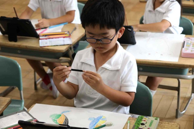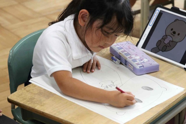 図工の授業で版画の学習をしました。版画のテーマは「水の中の生き物」で、今日は下絵を描きました。サメ、イルカ、ラッコなど、自分が好きな海の生き物を生き生きと描いていました。