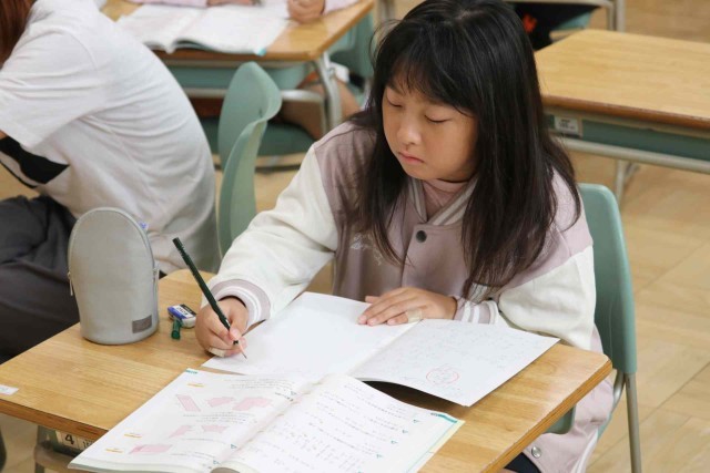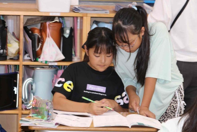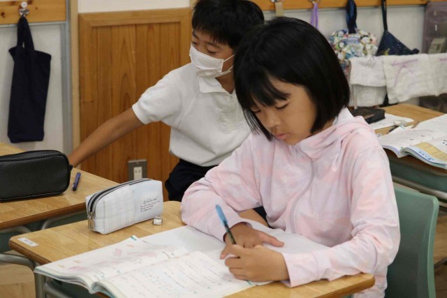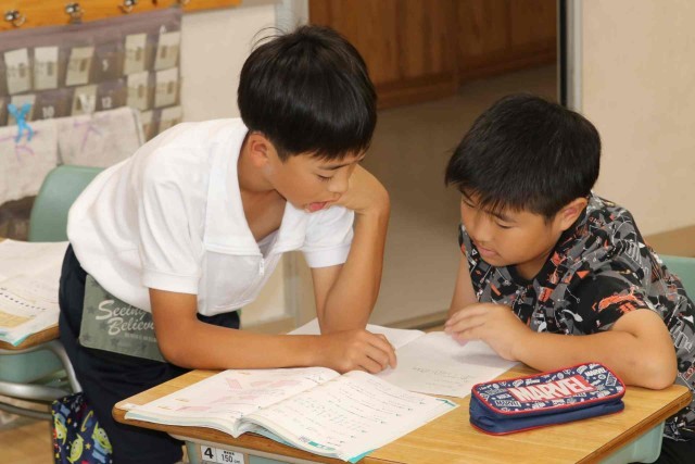 算数の授業で「HELLO」という人文字を作るのに何人必要なのかを考えました。縦と横が重なる人を数え間違えないように気をつけました。友達同士で考え方を確認していました。