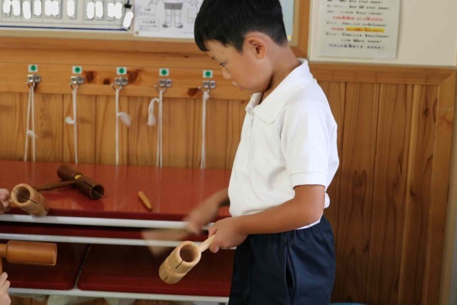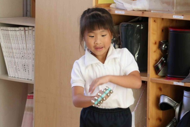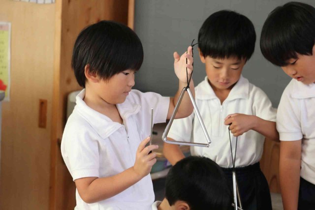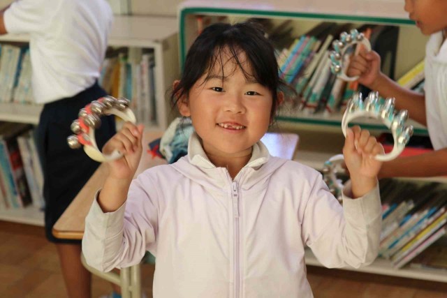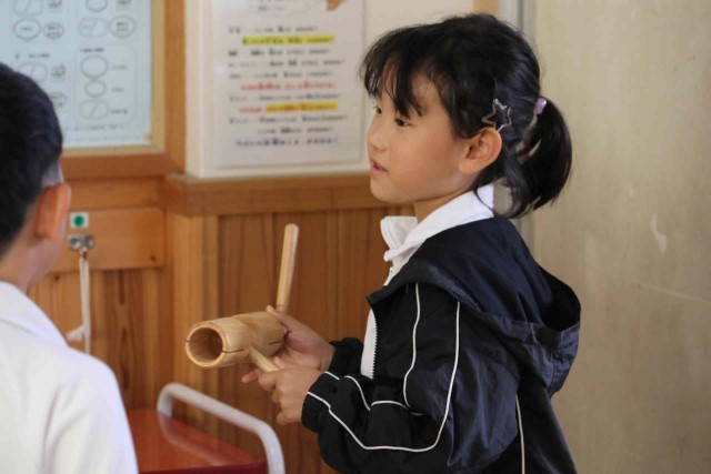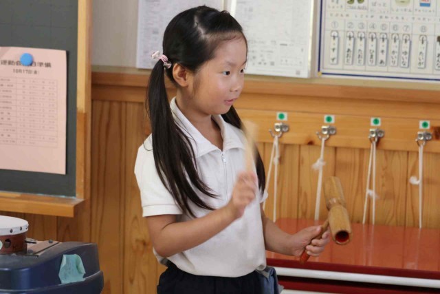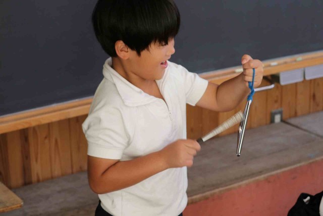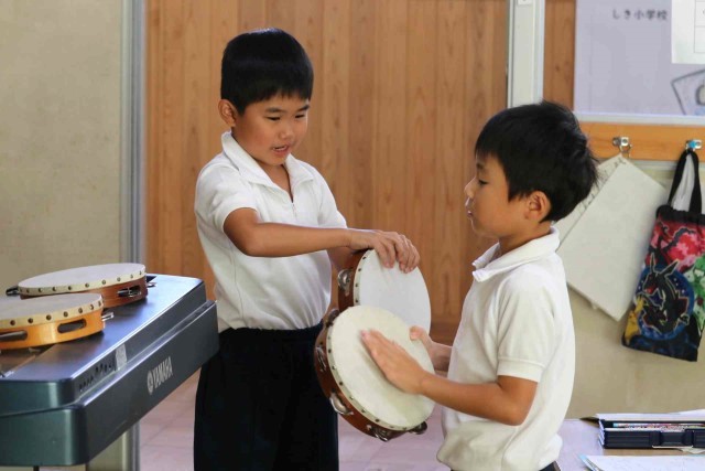 音楽の授業で打楽器の音色を聞く学習をしました。タンバリン、トライアングル、ウッドブロックを叩いた音色に耳を傾けました。「チーン」「トントン」「バンバン」など、聞こえた音を言葉で表現していました。