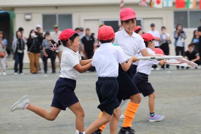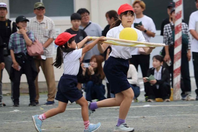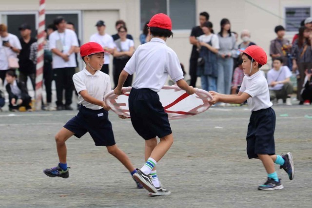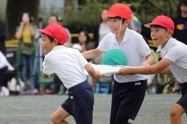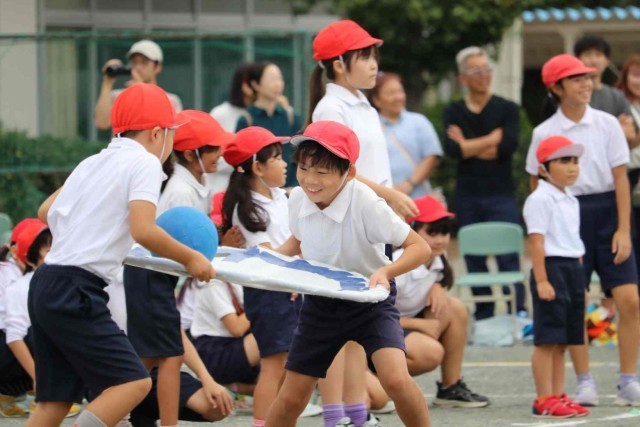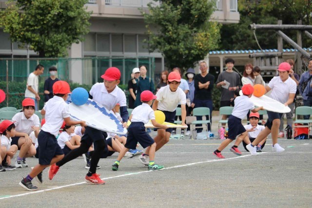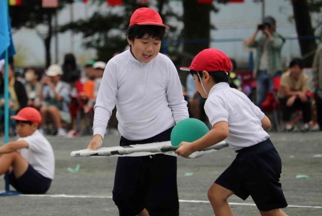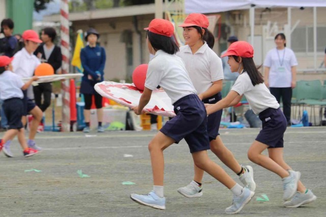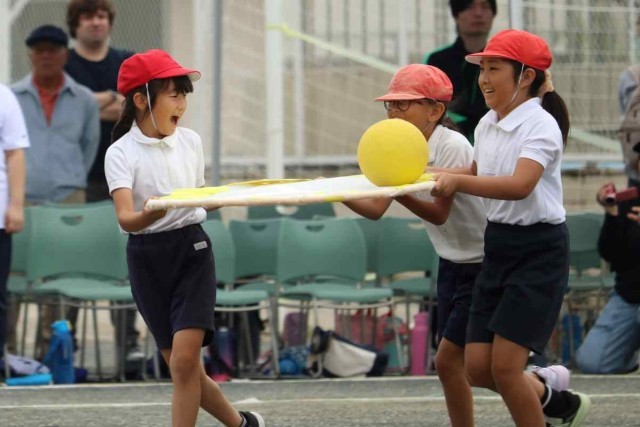 児童会種目の「ペアでダッシュ」をしました。縦割り学級対抗でボールを運ぶ速さを競いました。途中でボールが転がるアクシデントがあっても、「がんばれー」と大きな声援を受けていました。
