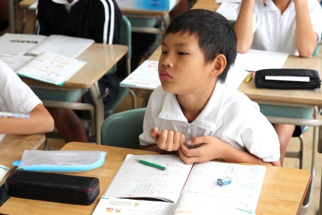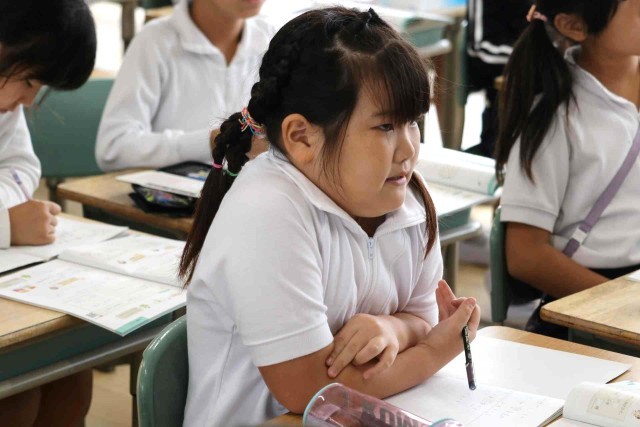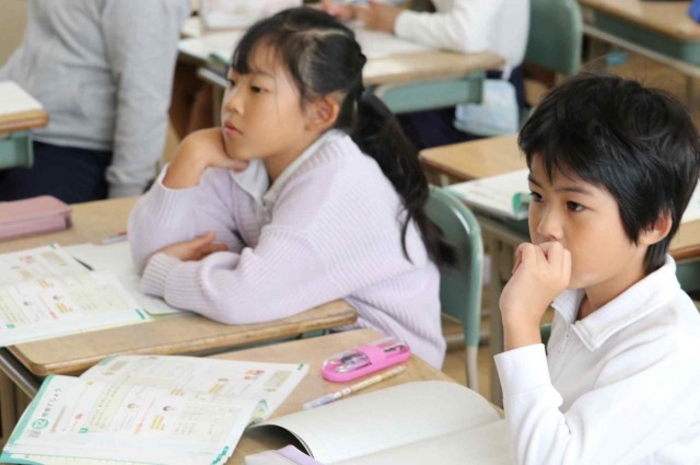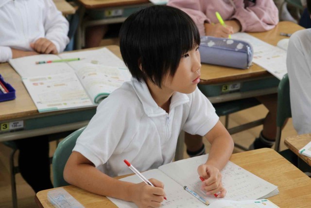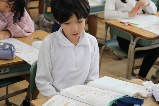 算数の授業で数量の倍関係について学習しました。赤い車が2m走り、黄色の車が12m走ったとき、黄色の車が何倍多く走ったのか考えました。九九を思い出して考えるよりも、「12÷2=6」と割り算を使った方が速く計算できることに気づきました。