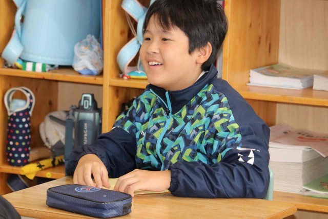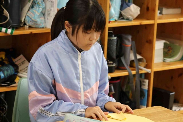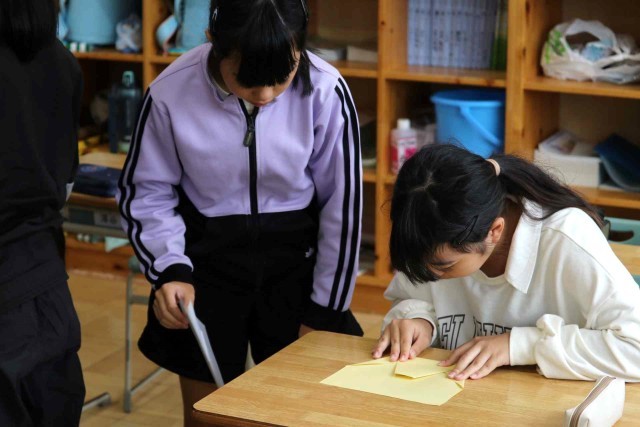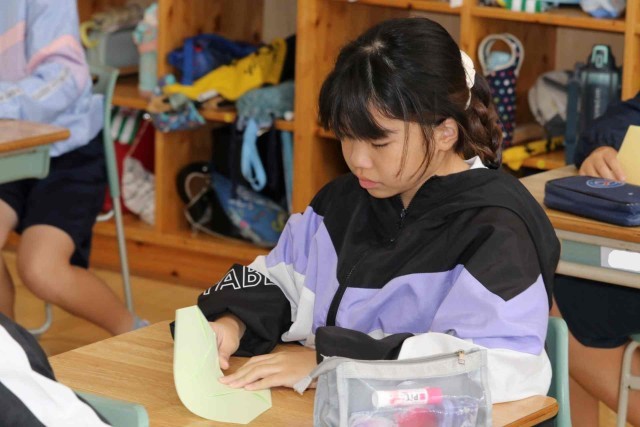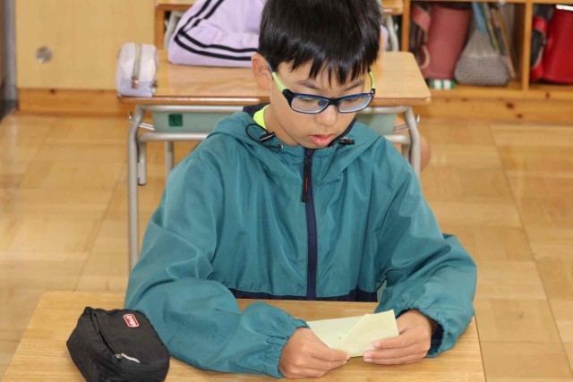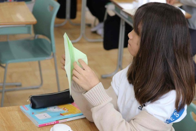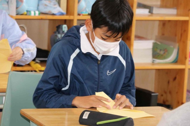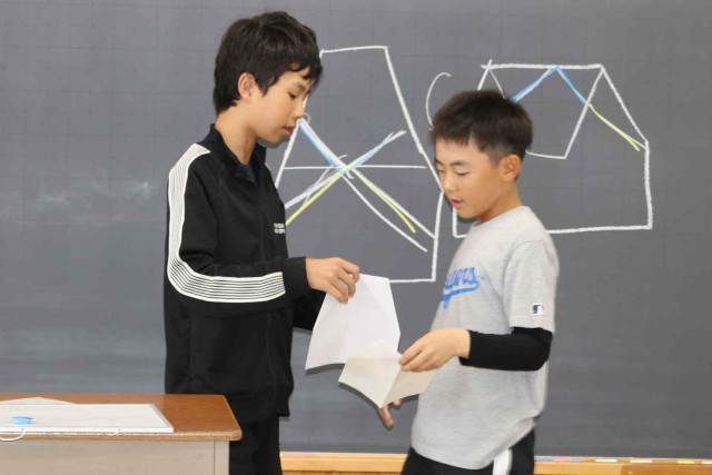 算数の授業で図形の学習をしました。一枚の紙をどのように折れば、紙飛行機を作れるのか考えました。代表の子が黒板の前に立って、手順の説明をしていました。