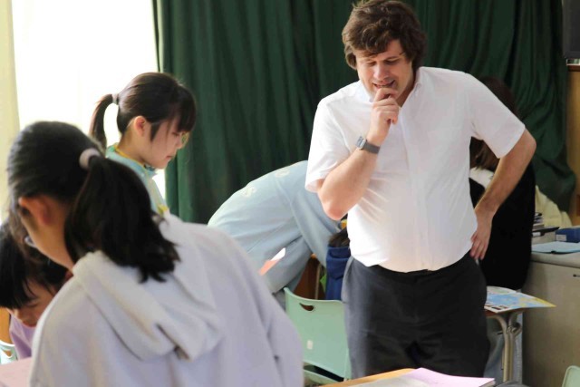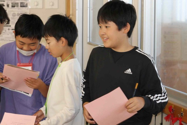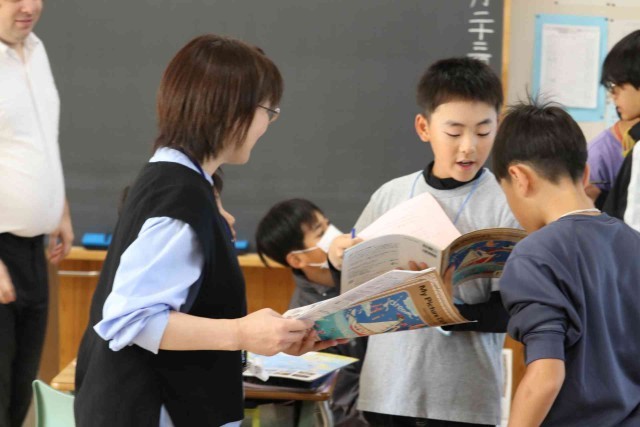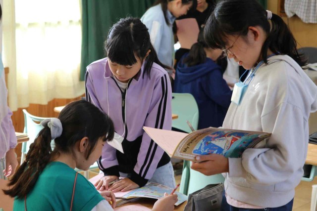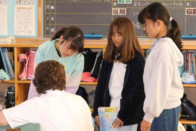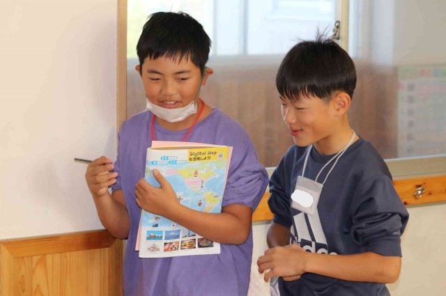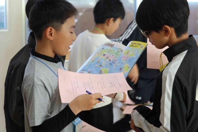 外国語の授業で場所を表す疑問詞whereの使い方を学習しました。世界地図を見ながら、食材や産地はどこか尋ね合っていました。