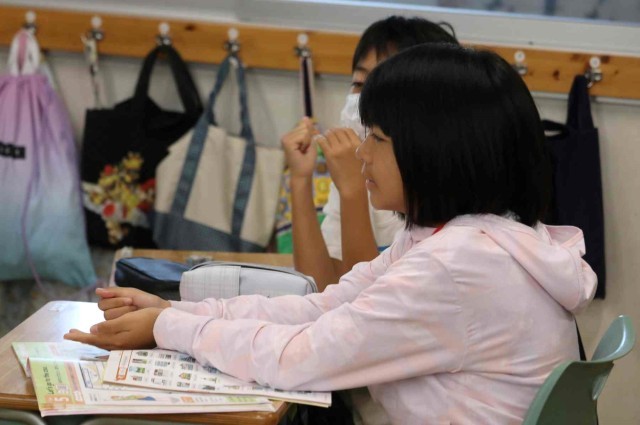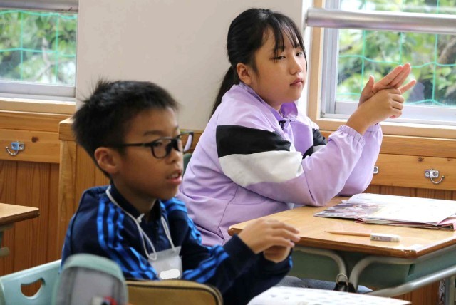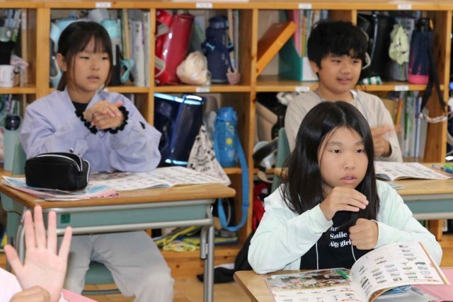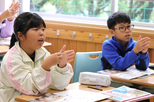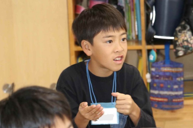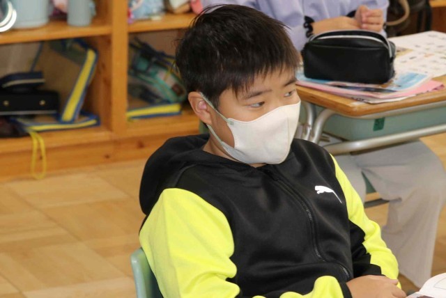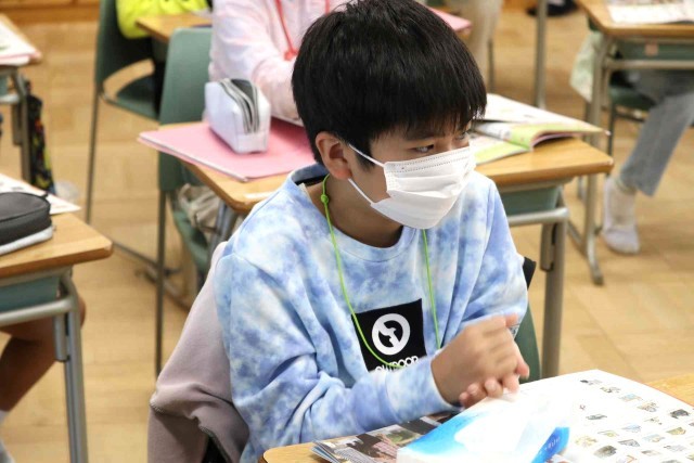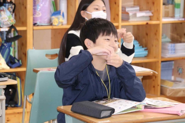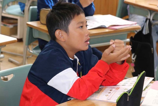 外国語の授業で場所を表す表現を学習しました。上を示す「on」、中は「in」、下は「under」など、手の動きを加えながら理解していました。