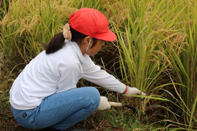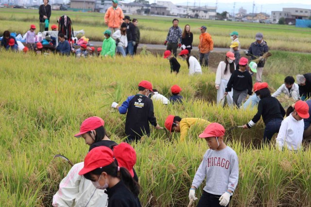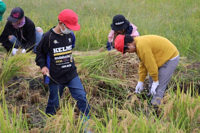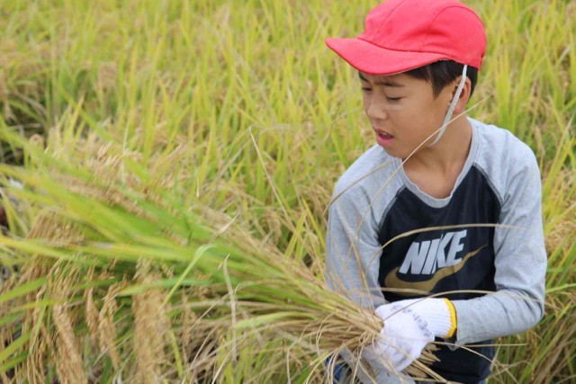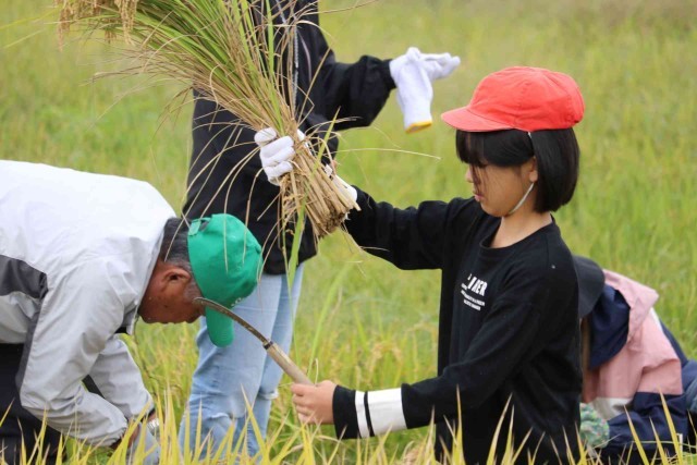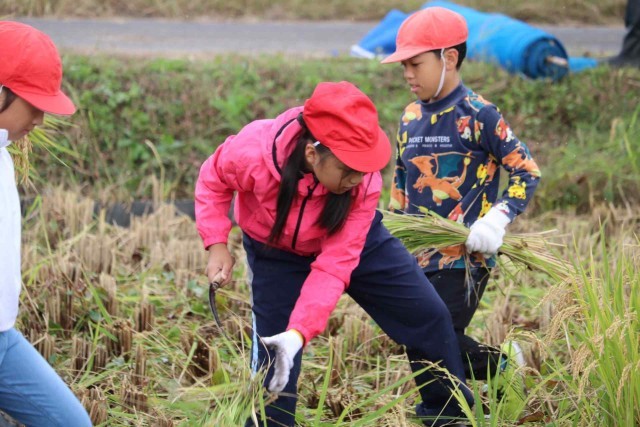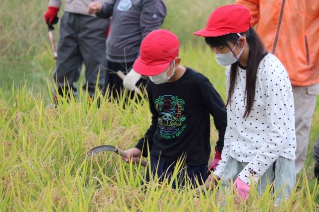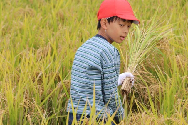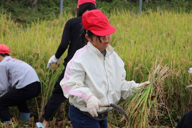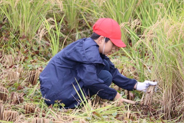 たわわに実ったもち米を収穫しました。最初は力を加減してゆっくり刈っていましたが、慣れてくるとすごいスピードで刈り取ることができました。終わった後は、心地よい疲れを感じながら農業の大変さを実感した様子でした。