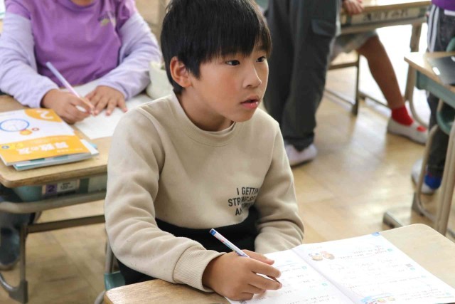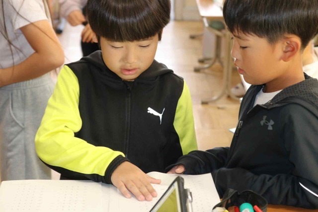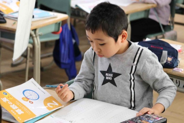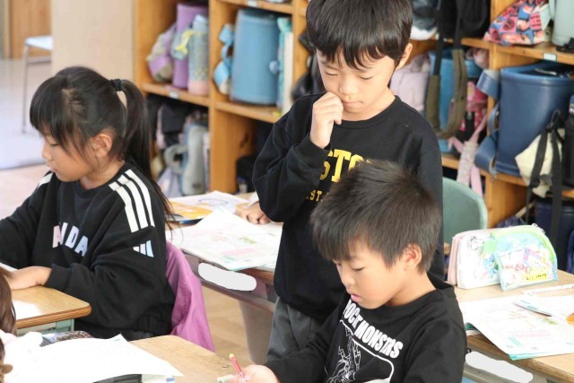 算数の授業で九九の学習をしました。今日は3の段を活用する問題を解きました。「3人がけのベンチが4つあるとき、何人すわれますか」という課題を読んで、「3×4=12」と答えることができました。