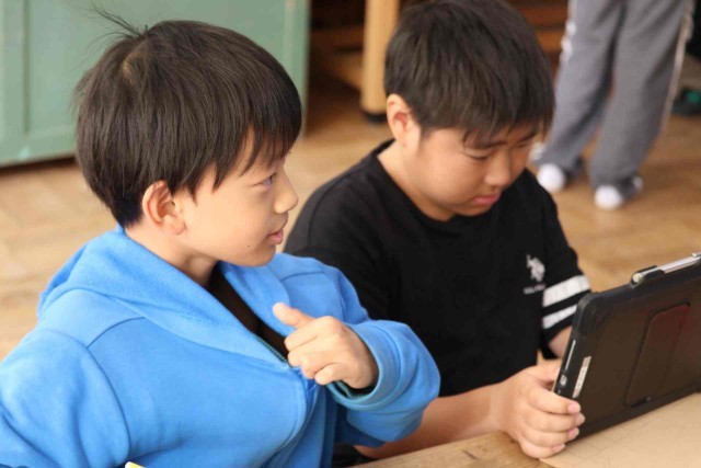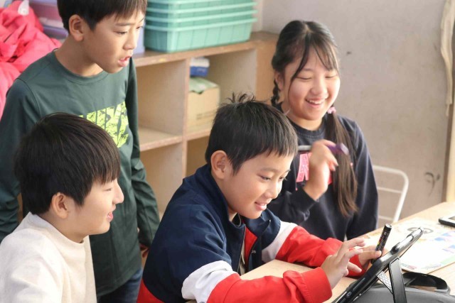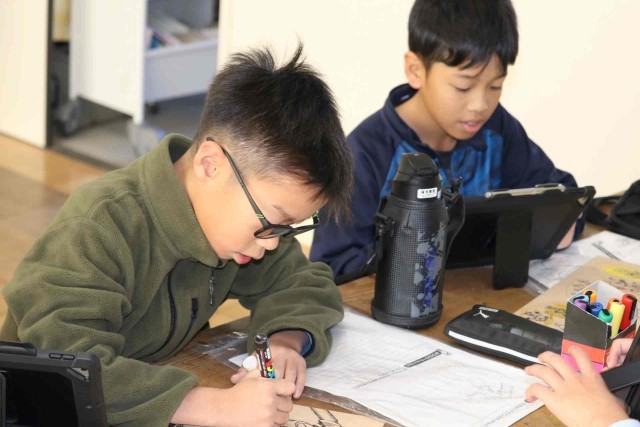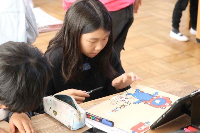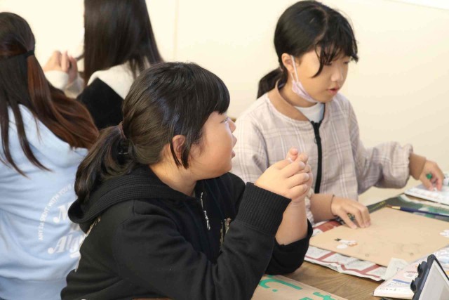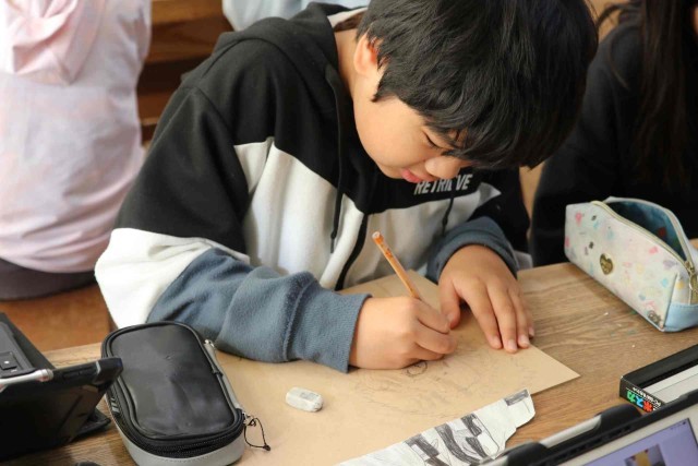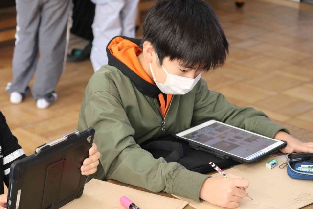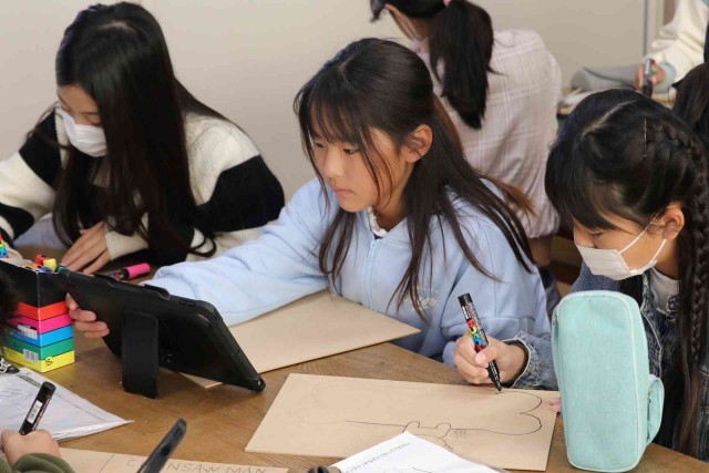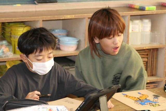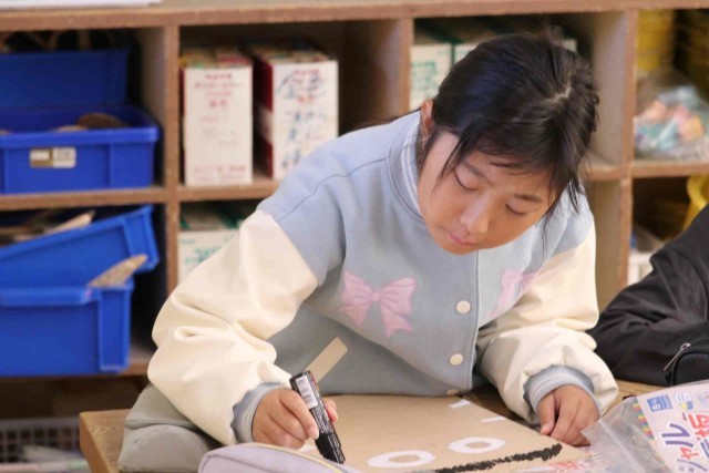 図工の授業で木工の学習をしました。自分だけの伝言板にするため、木材に色を塗りました。好きなキャラクターや動物の絵がきれいに描かれていました。この後は、木材を切る工程に入ります。
