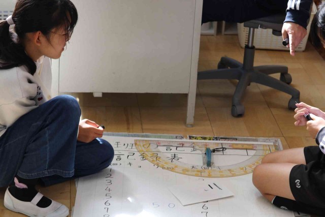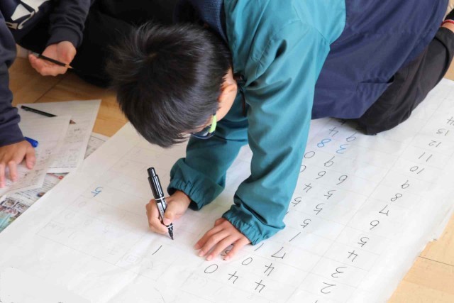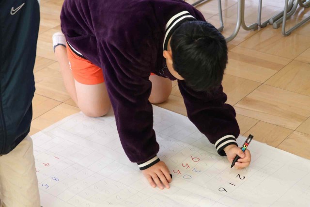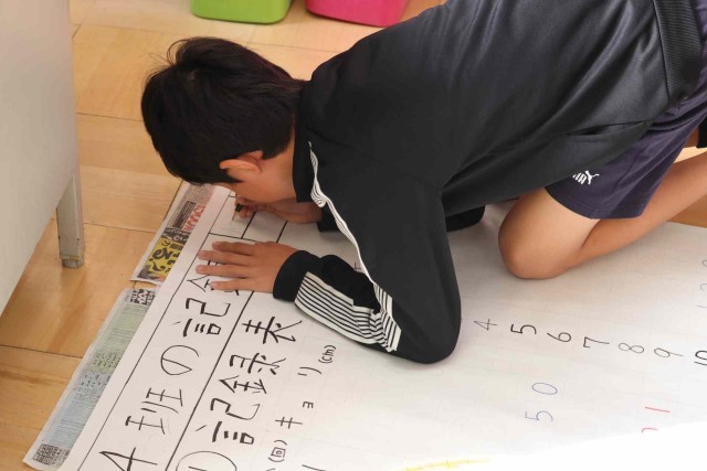 算数の授業で最大値と最小値の学習をしました。紙飛行機が飛んだ距離を計測して、B紙にまとめました。一番遠くまで飛んだ距離を最大値、飛ばなかった距離を最小値として目立つようにしていました。