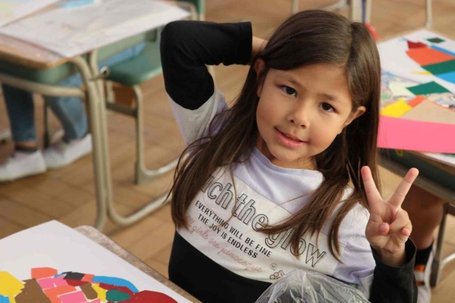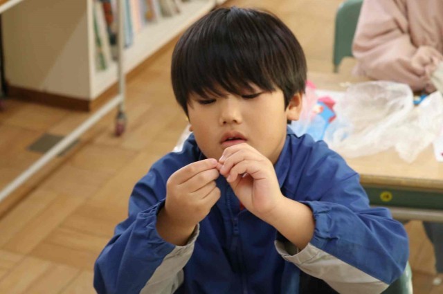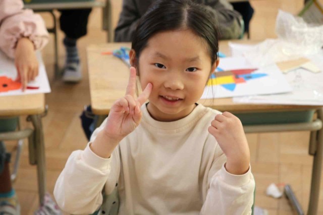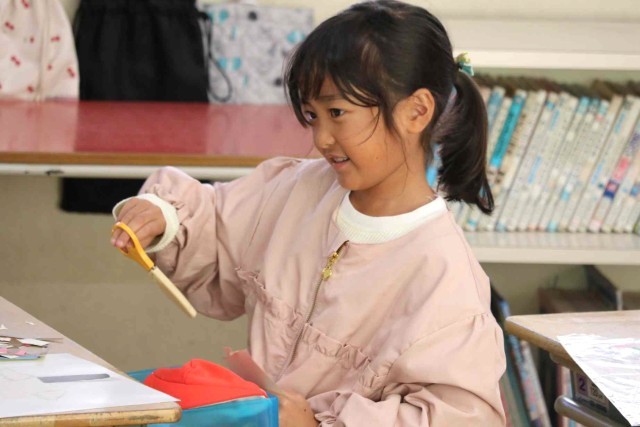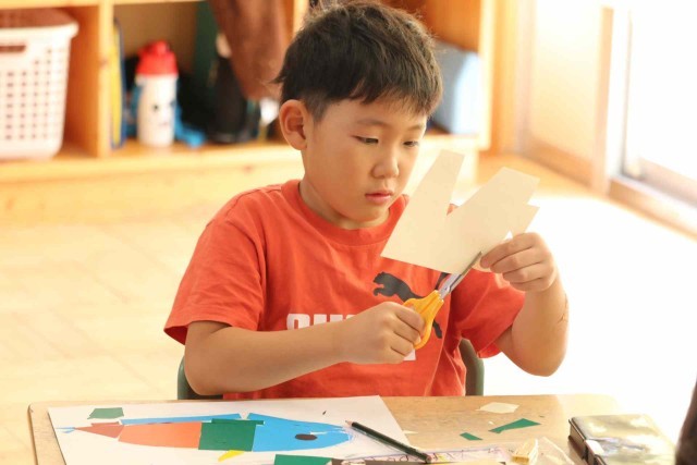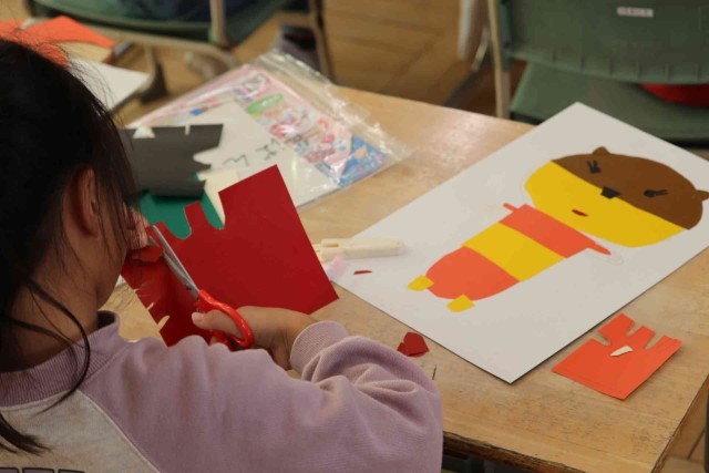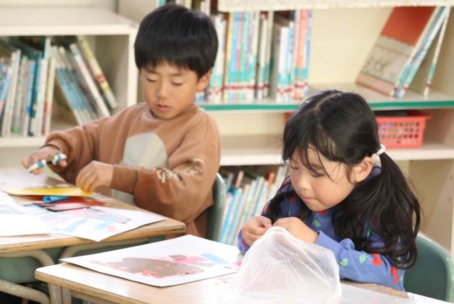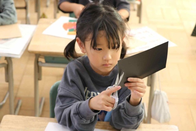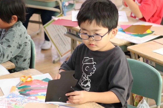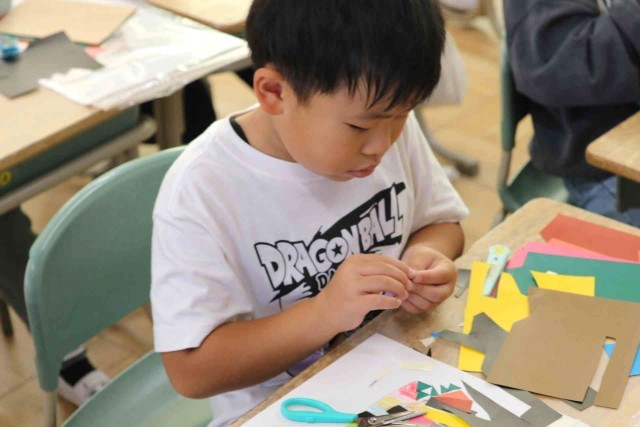 図工の授業で版画制作をしました。色紙を切り取って、台紙にぺたぺた貼っていきました。魚やラッコなど、海の生き物の形が少しずつはっきりしてきました。