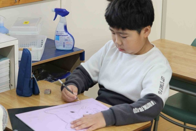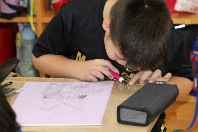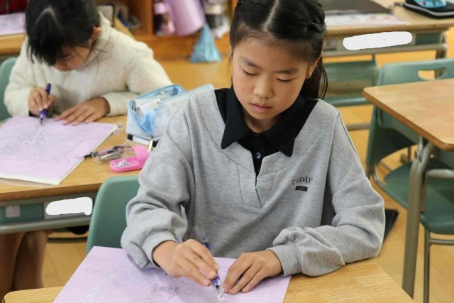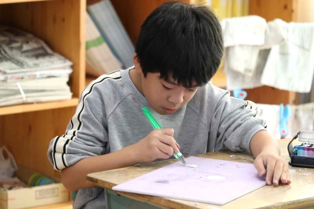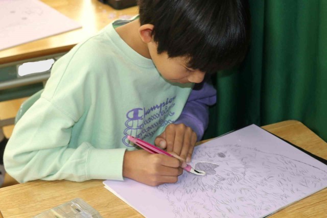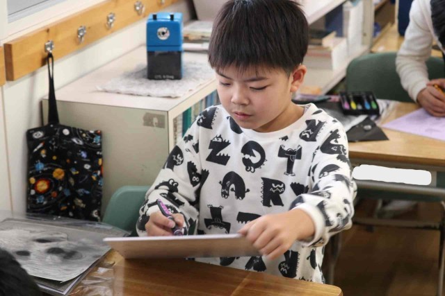 図工の授業で版画の学習をしました。ライオンや白熊など好きな動物を選んで、下絵を木版に描きました。描けた子から彫刻刀をもって、彫りの作業に入りました。毛がふさふさしている様子を表現しようとがんばっていました。