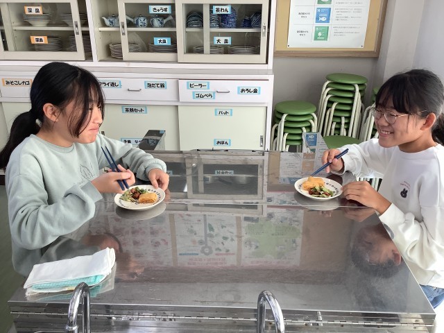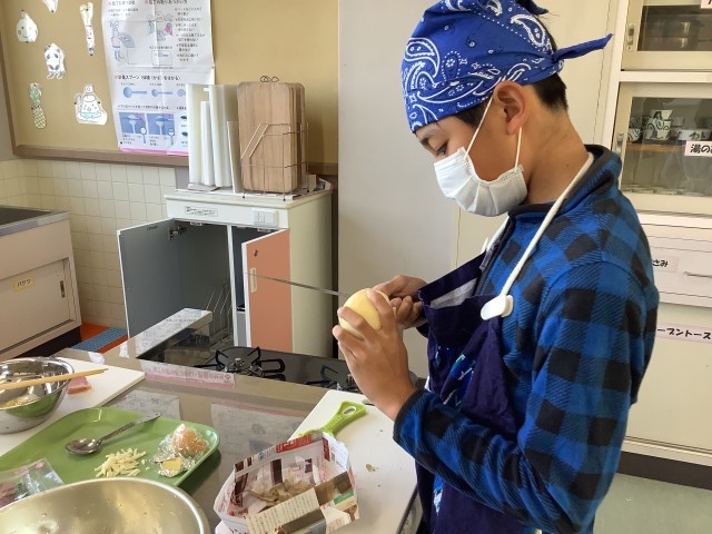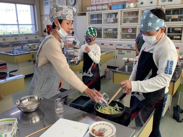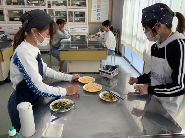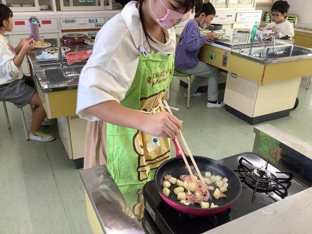 ゆでたり、いためたりして主菜と副菜を作りました。ペアで作るものや材料、作り方を調べて、手際よく調理することができました。