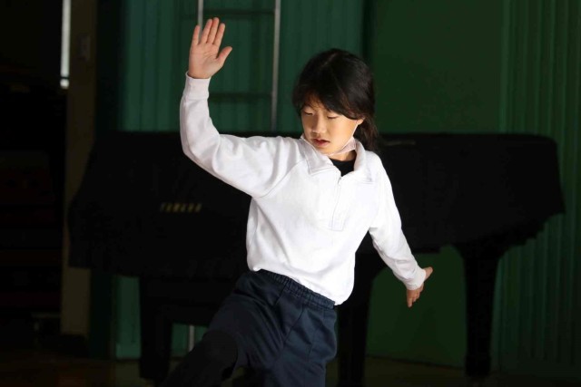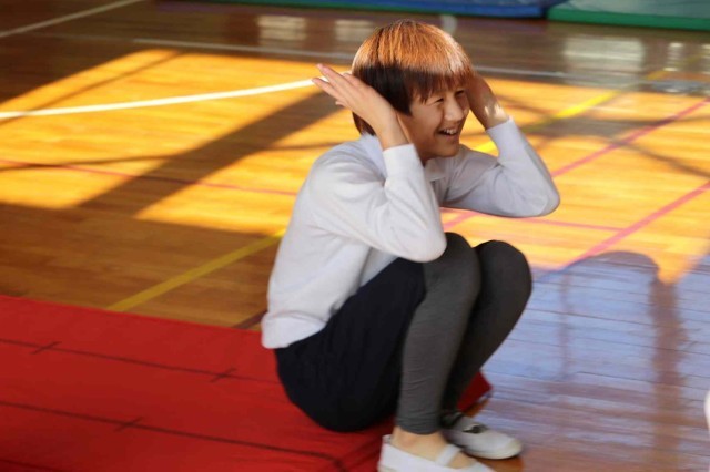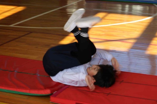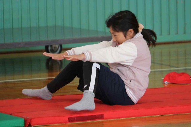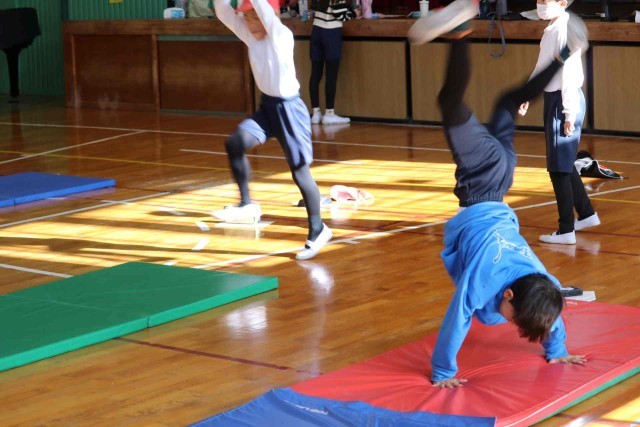 体育の授業でマット運動をしました。前転、後転、側転など、自分が決めた技の練習に励んでいました。きれいに技が決まると、友達と喜ぶ姿がありました。