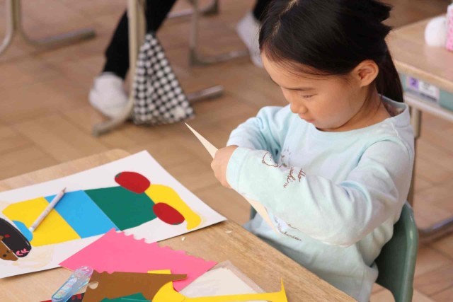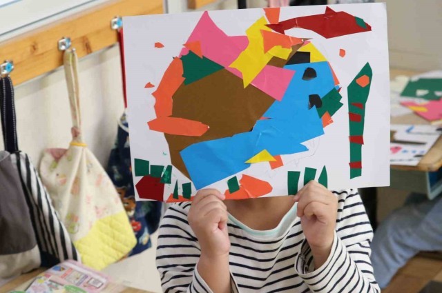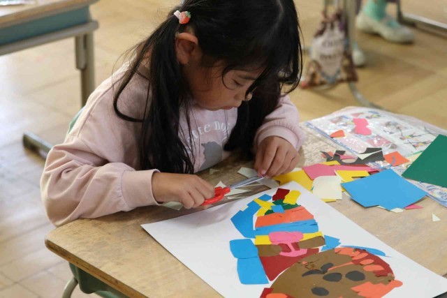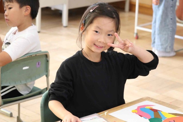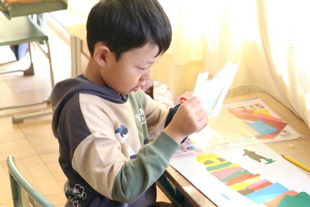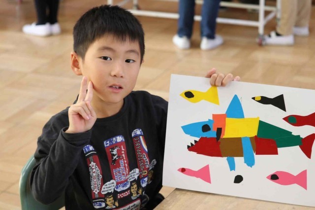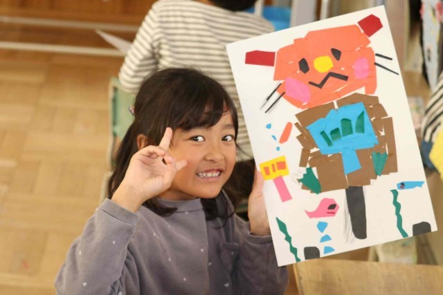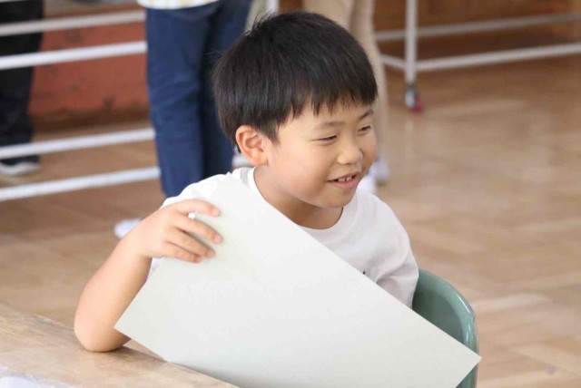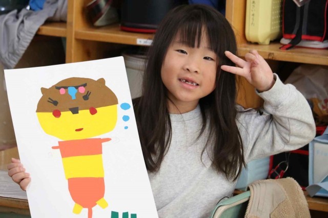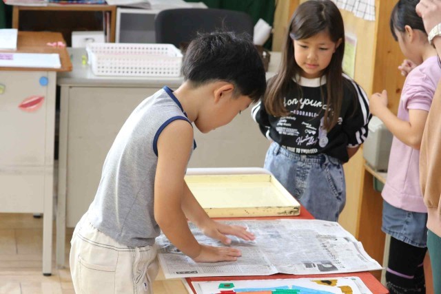 図工の授業で版画の学習をしました。台紙を水でぬらして吸い取り紙でこすると、カラフルな水の中の生き物が浮かび上がりました。みんな満足のいく作品に仕上がったようでした。