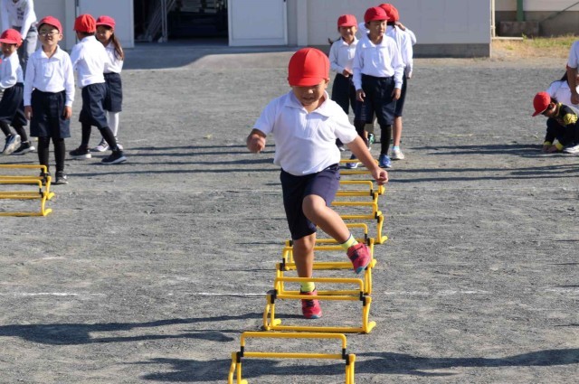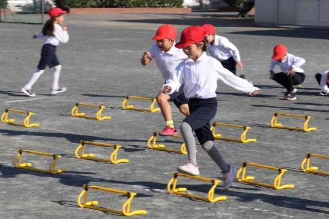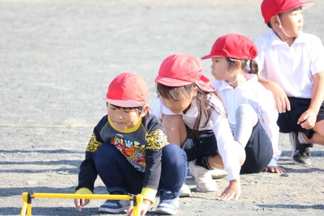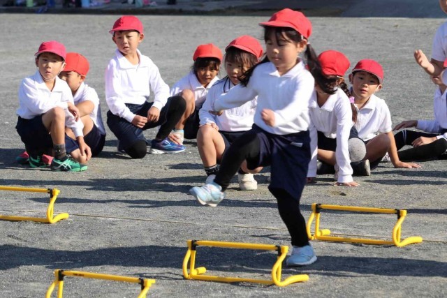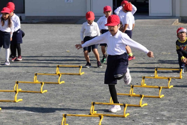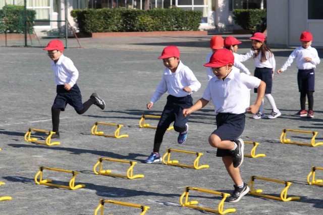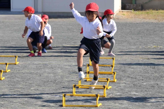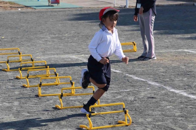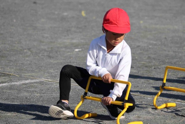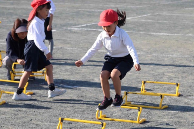 体育の授業でミニハードルを使った運動をしました。両足で跳んだり、片足で軽々と越えたりしました。少しずつ高さを上げても楽しそうに跳び越えていました。