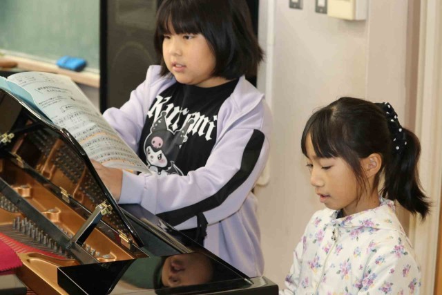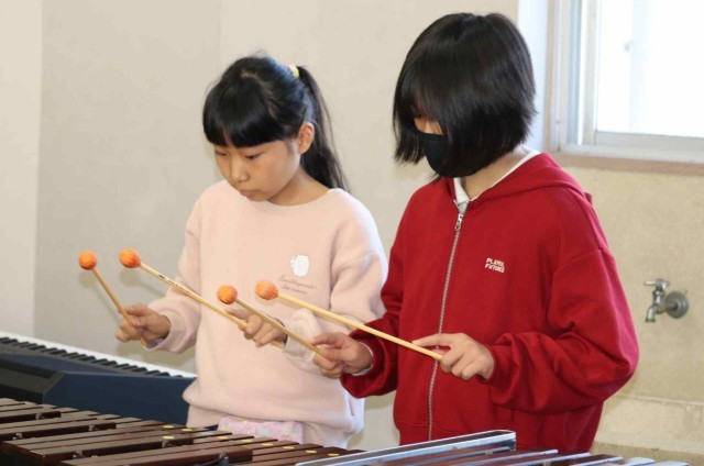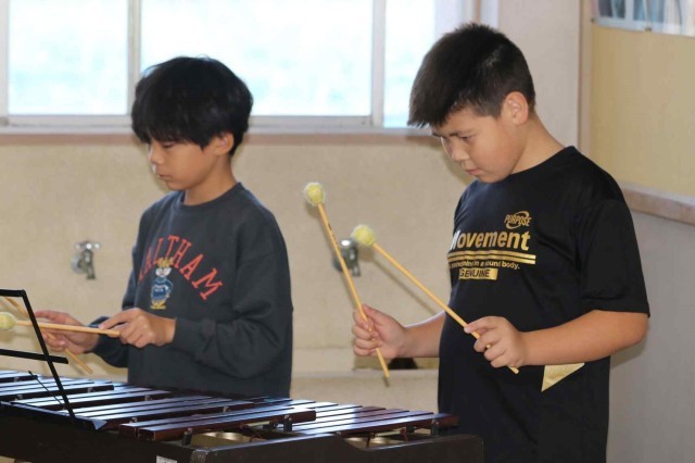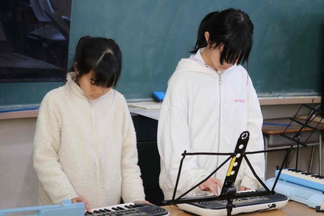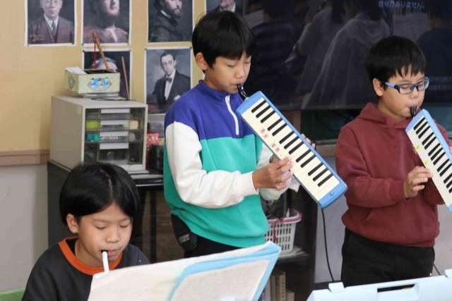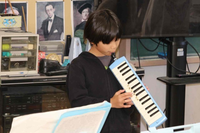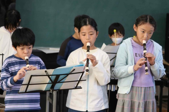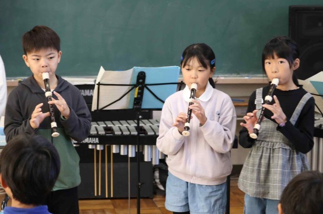 音楽の授業で楽器の演奏をしました。2つのグループに分かれて、「茶色の小びん」を発表しました。旋律やテンポが乱れることなく、とても見事な演奏を聞くことができました。
