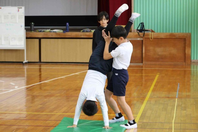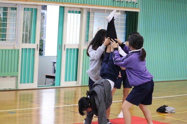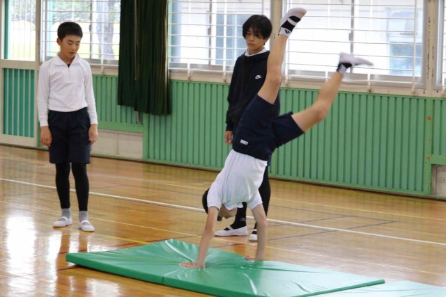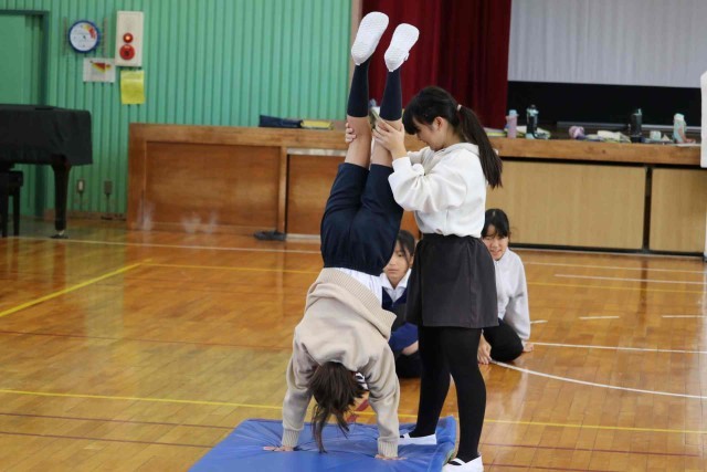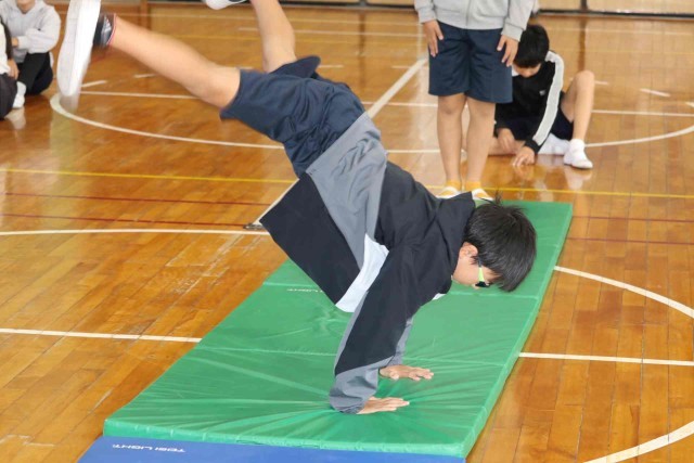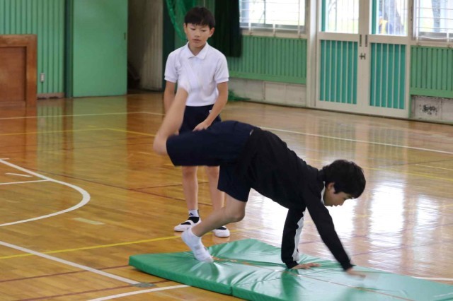 体育の授業でマット運動をしました。倒立や側転など、自分が選んだ連続技を練習しました。参考動画を見たり、友達にアドバイスをもらったりして上達できるようがんばっていました。