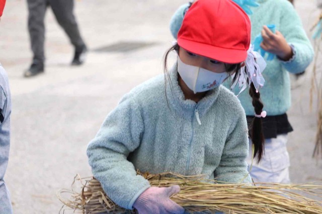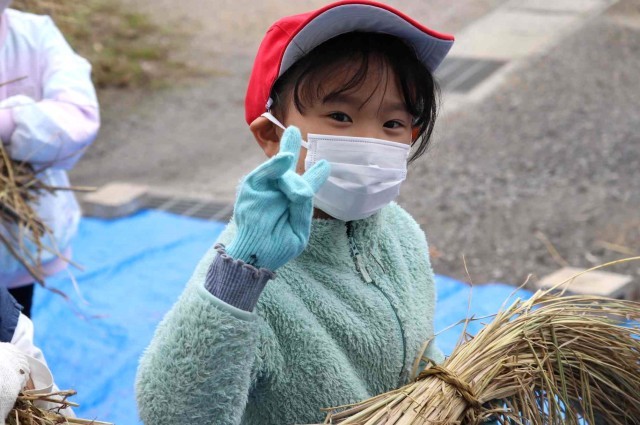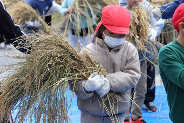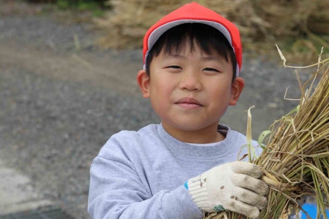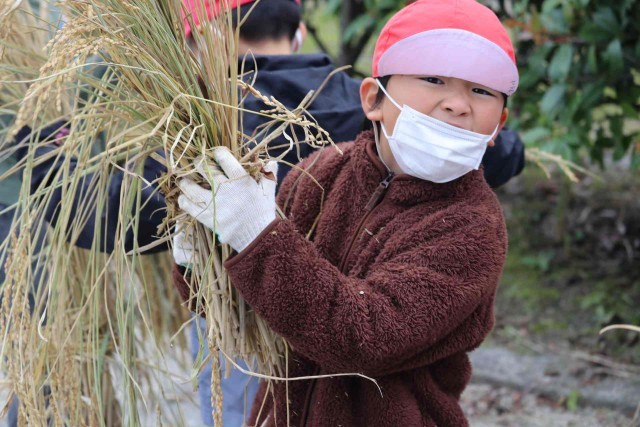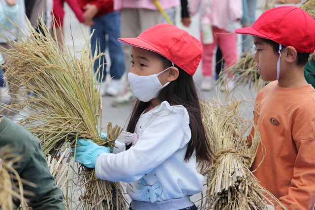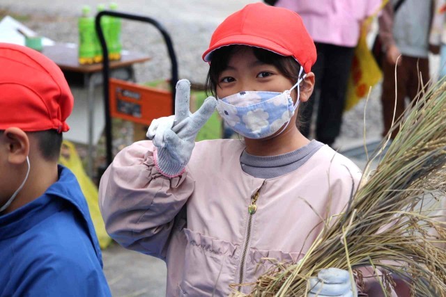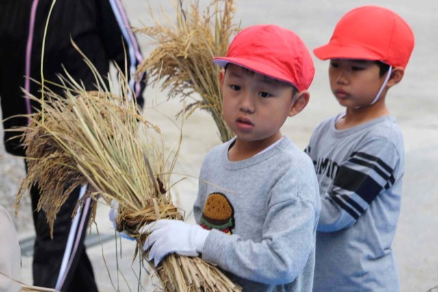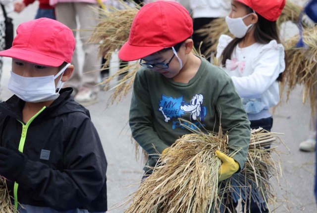 1年生が脱穀体験をしました。志貴保育園の子は一度経験していますが、他の子にとっては初めての脱穀でした。稲を手に持つと、自然とみんな笑顔になっていました。大地の恵みに感謝して、食べ物を大切にする心をもってほしいと思います。