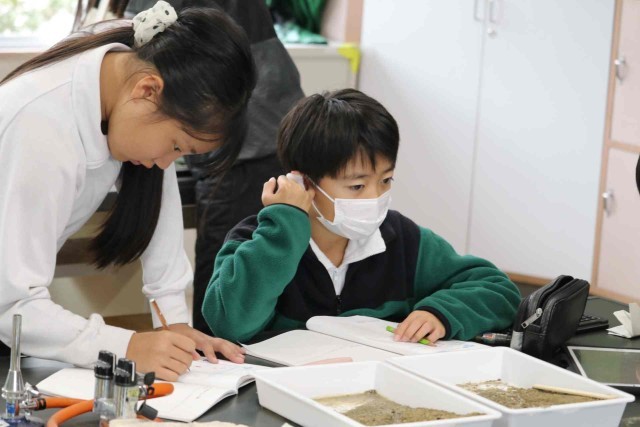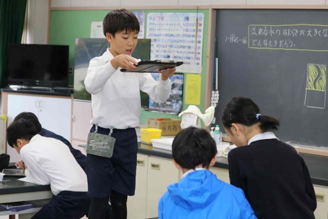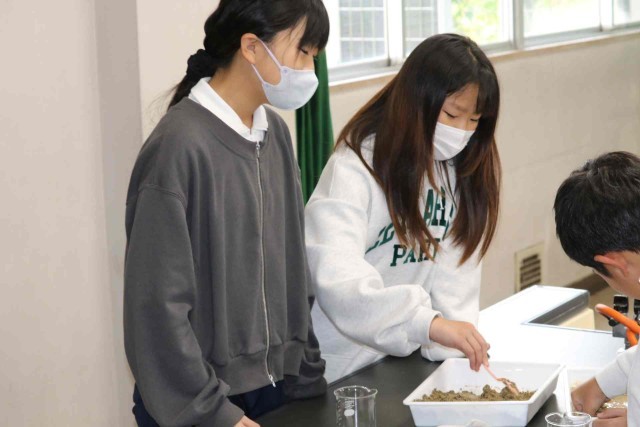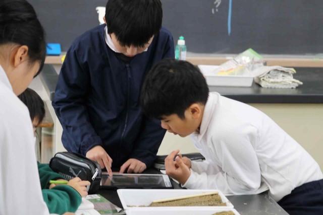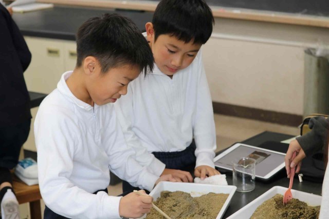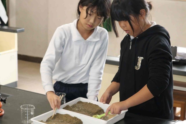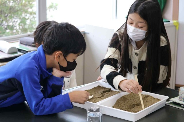 理科の授業で土砂に水を流すとどうなるか実験しました。流れる水の力によって、土が削れていく様子を観察しました。運ばれた砂の量などを調べてまとめていました。