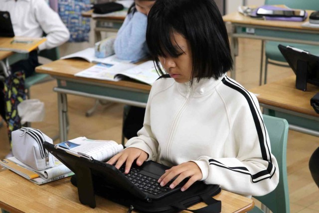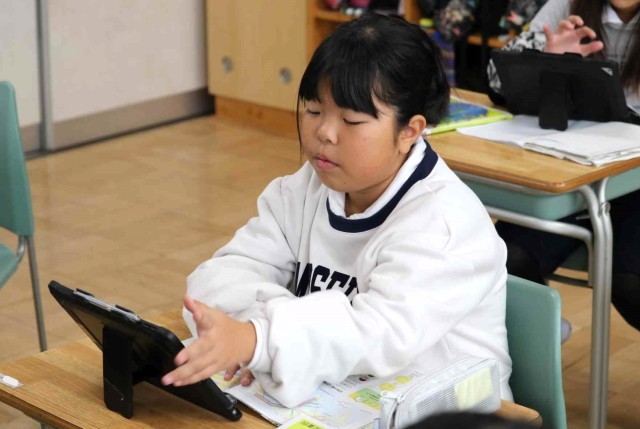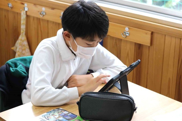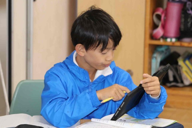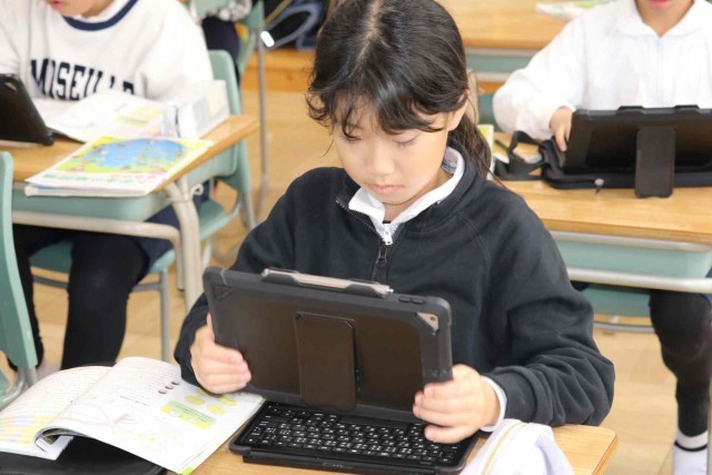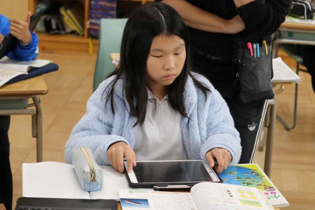 社会の授業で日本の輸入や輸出について調べ学習をしました。工業製品や農産物、エネルギー関連など、どんなものを輸出入しているのかインターネットで調べました。分かったことをタブレットに入力していました。