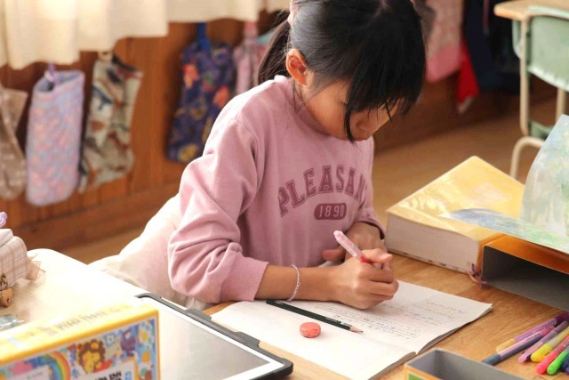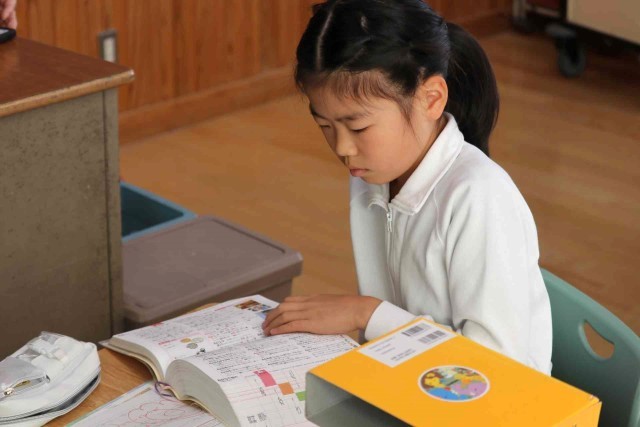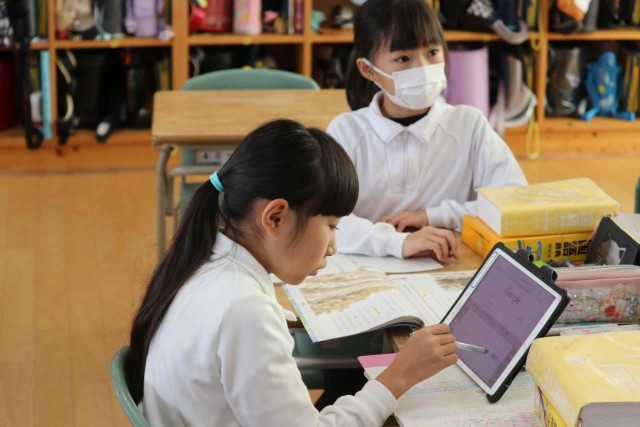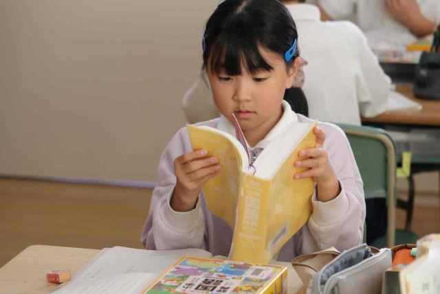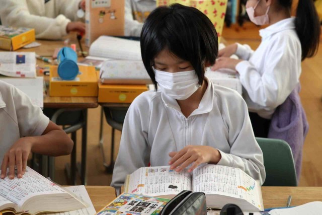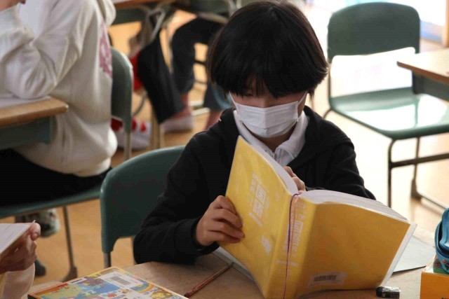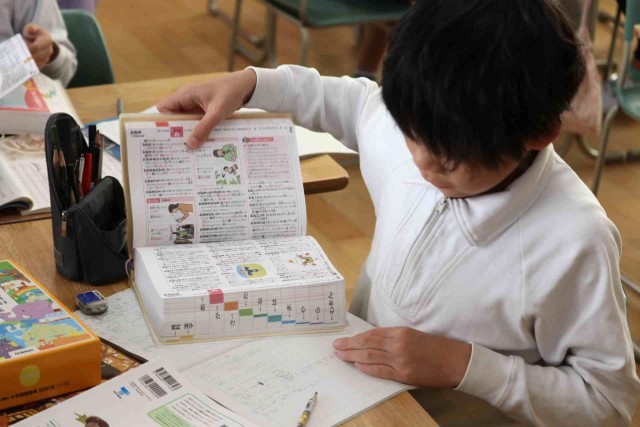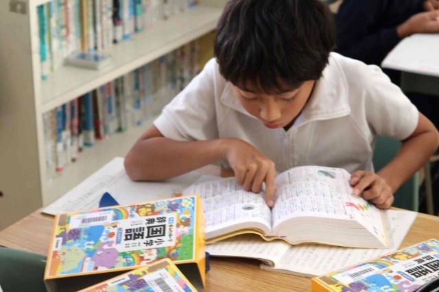 国語の授業でごんぎつねの話を読みました。文の中にある新しい語句を辞書で調べていました。「ひがん花」「家内」「よそ行き」など、分かったことをグループで共有していました。