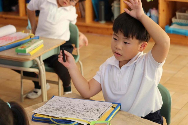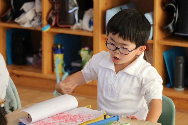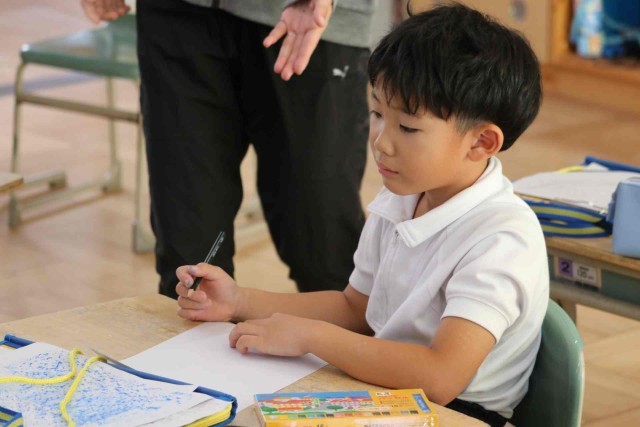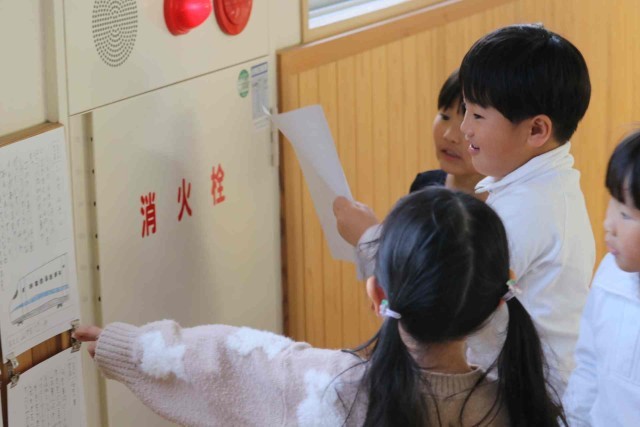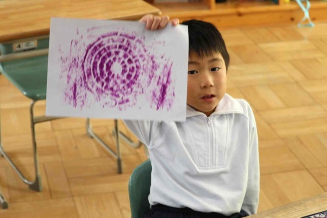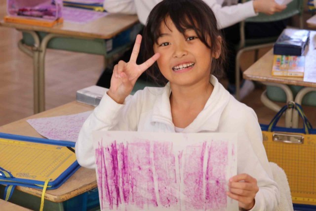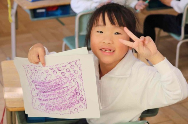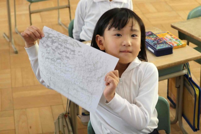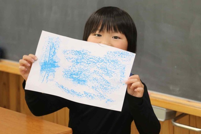 図工の授業でクレパスを使った作品作りをしました。でこぼこのある場所に紙を当てて、クレパスでこするといろいろな模様が浮かび上がりました。教室の中だけでなく、廊下や運動場に出て、でこぼこの場所を探していました。