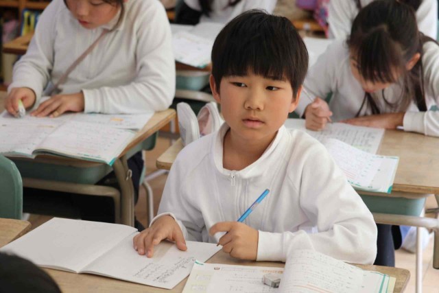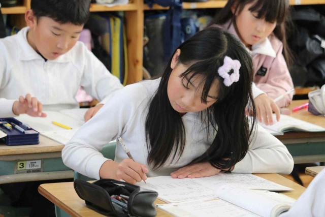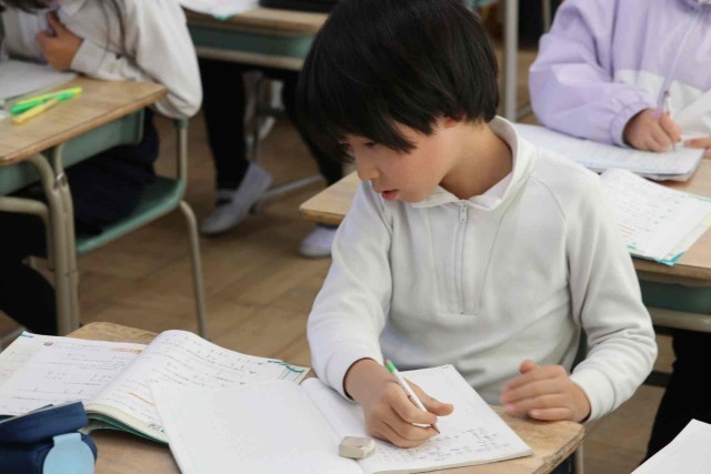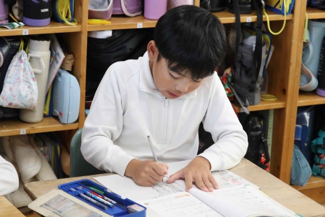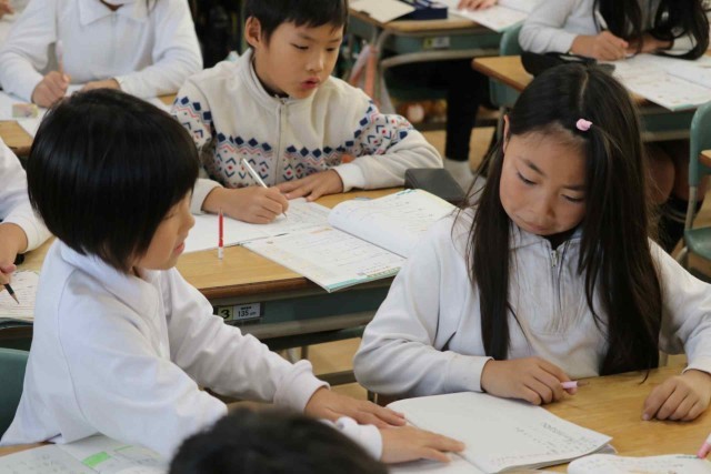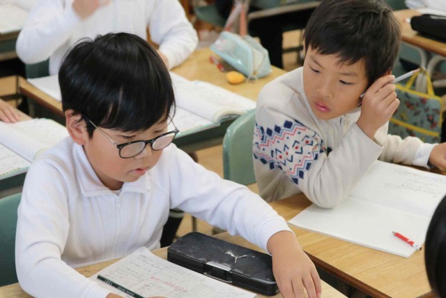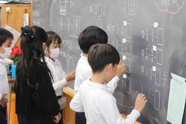 算数の授業で分数の学習をしました。昨日の分数の足し算のやり方を思い出しながら、練習問題を解いていました。近くの子でお互いの答えを確認していました。