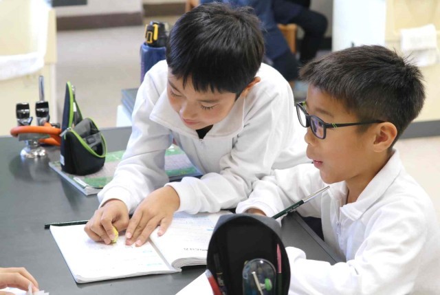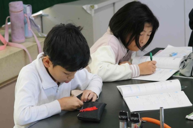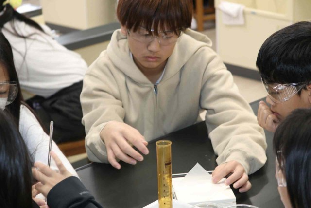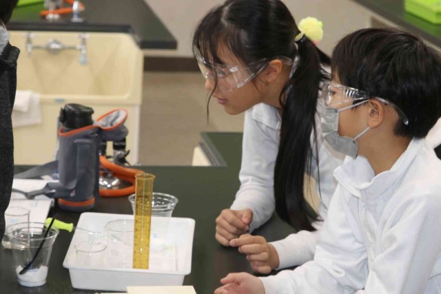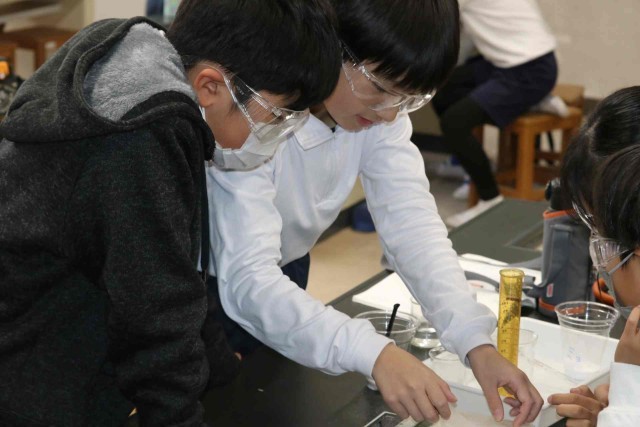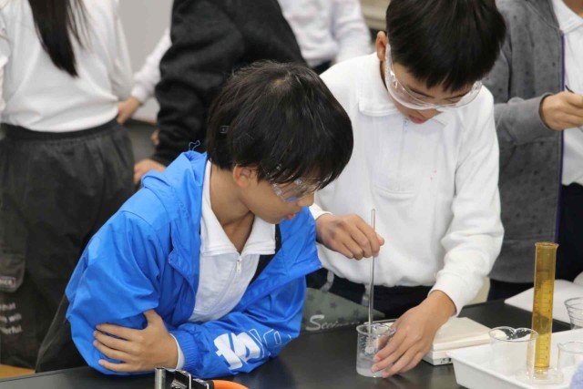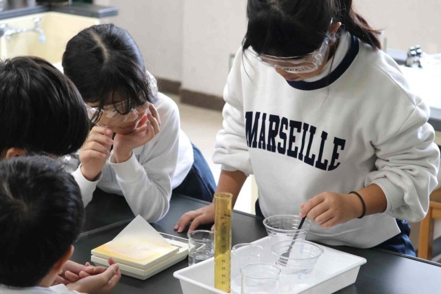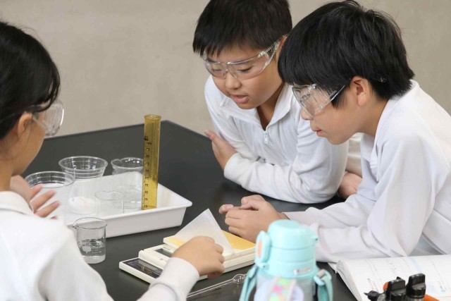 理科の授業で塩やミョウバンを水に溶かす実験をしました。水に溶ける量に限界があるのか、2グラムずつ溶かしていました。班ごとに結果が違っていて、これからどのように考察するのか楽しみです。