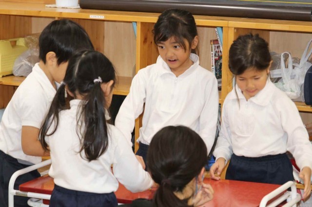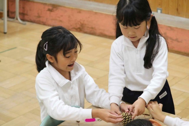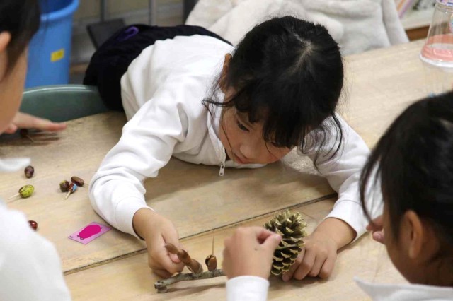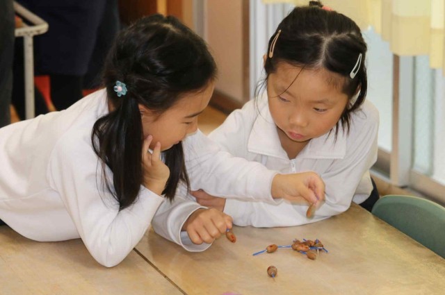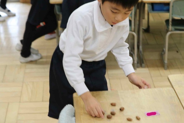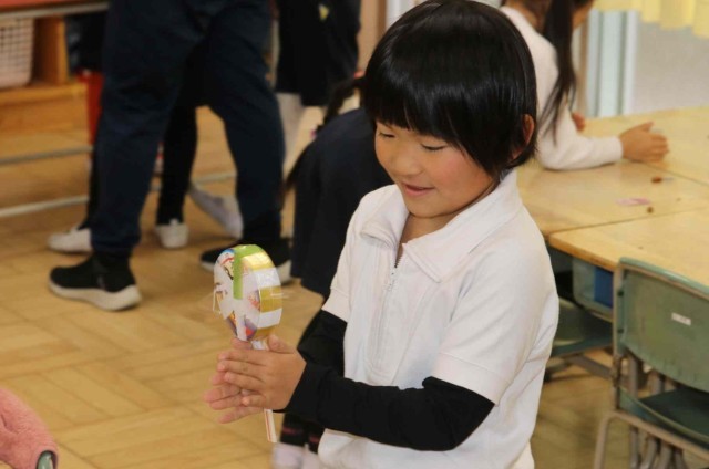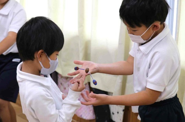 生活科の授業でおもちゃ遊びをしました。友達といっしょに遊びながら、それぞれのおもちゃの工夫してあるところや面白いところを見つけました。よいところを取り入れて、さらに楽しく遊べるように考えました。