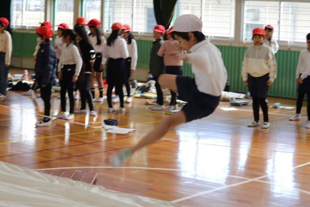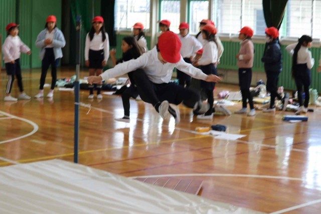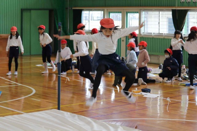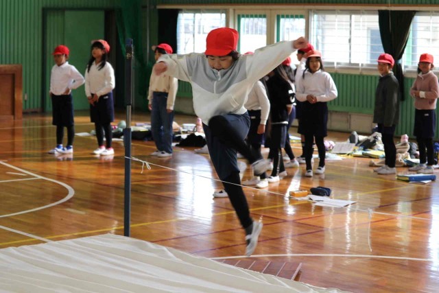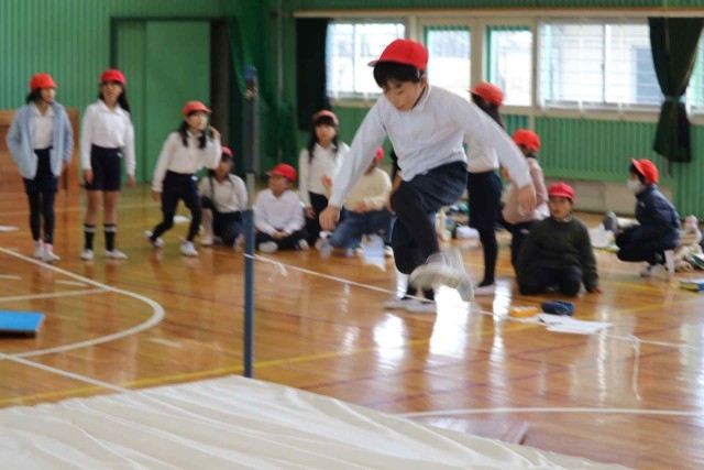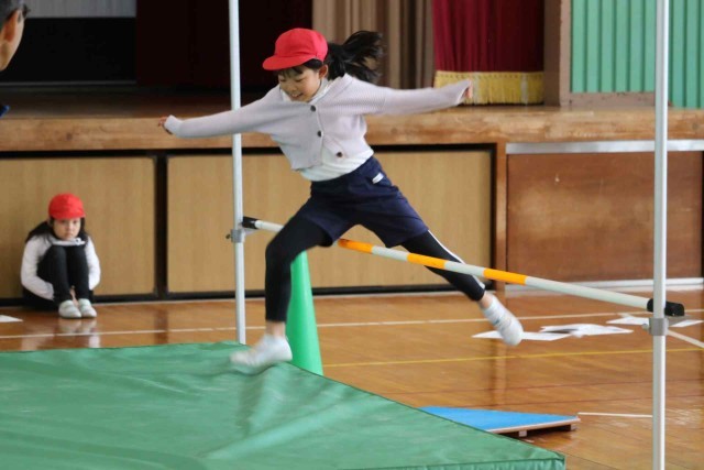 体育の授業で走り高跳びの学習をしました。助走を3歩か5歩に決めて、踏み切り版を力強く蹴っていました。最初に比べると、はさみ跳びのフォームが身についてきた子がたくさんいました。
