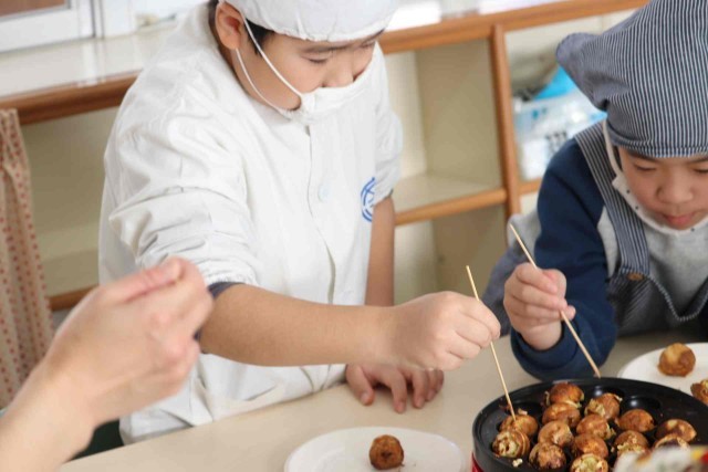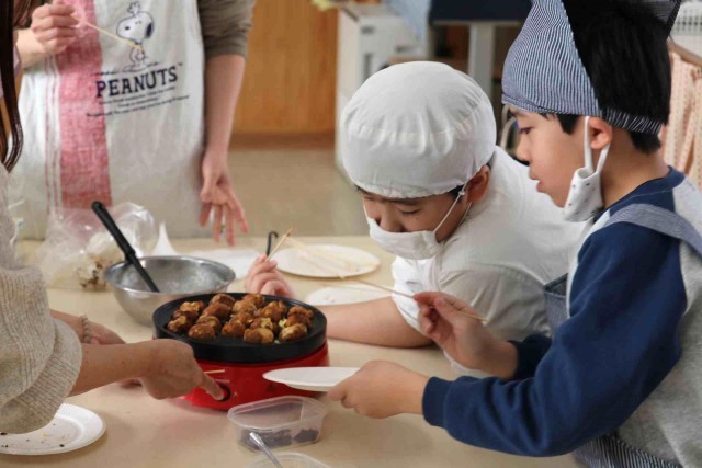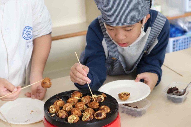 たんぽぽ組で地域交流をしました。別の学校から来てくれた子に温かくおもてなしをしました。たこ焼き器でカステラのようなお菓子を作り、とてもおいしくいただくことができました。