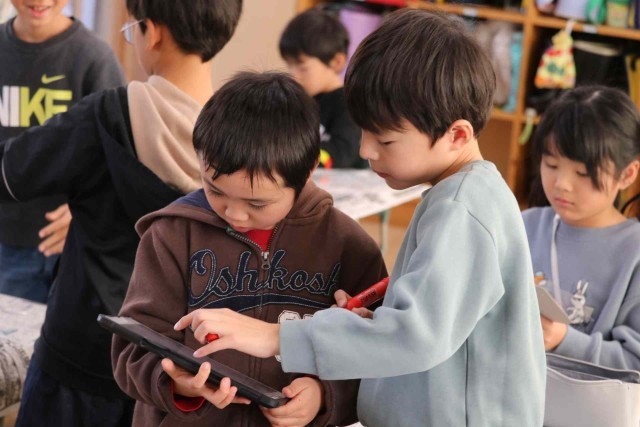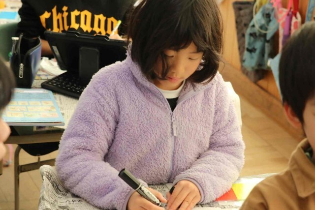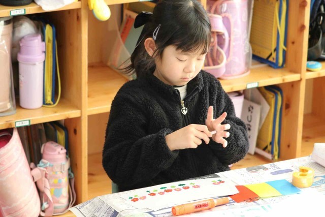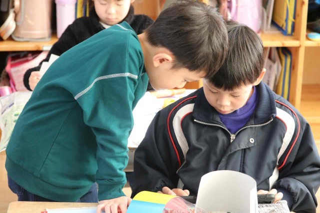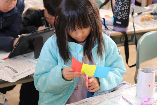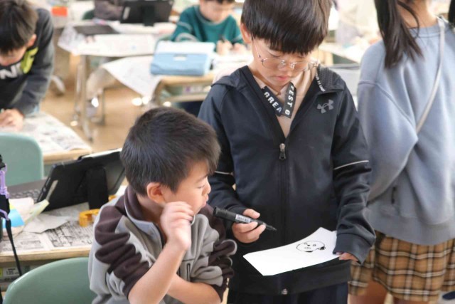 図工の授業でコップを使った工作をしました。くるくる回すといろいろな絵が出てくるようにデザインしました。パンダやコアラなど、動物の絵に人気が集まっていました。