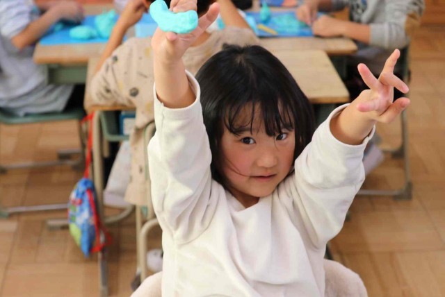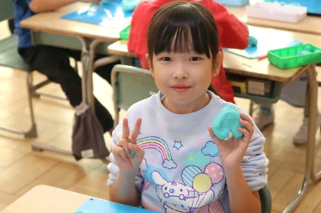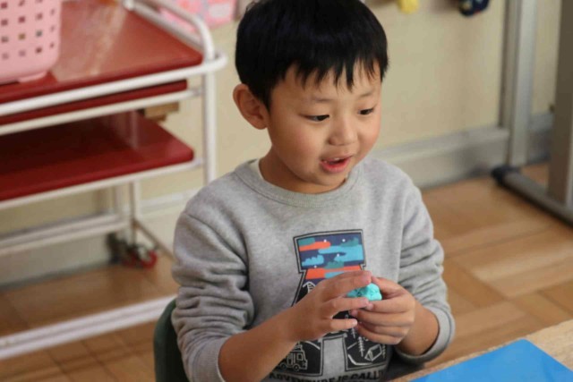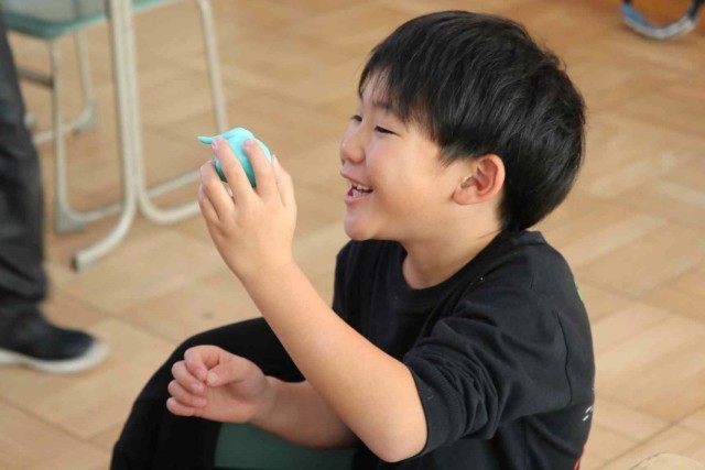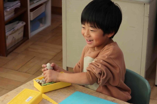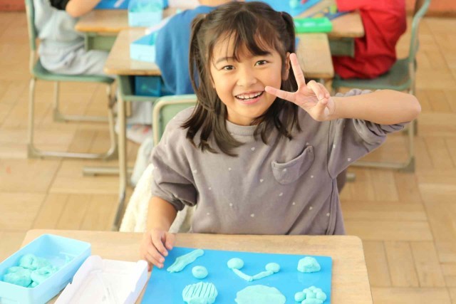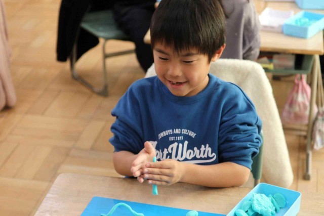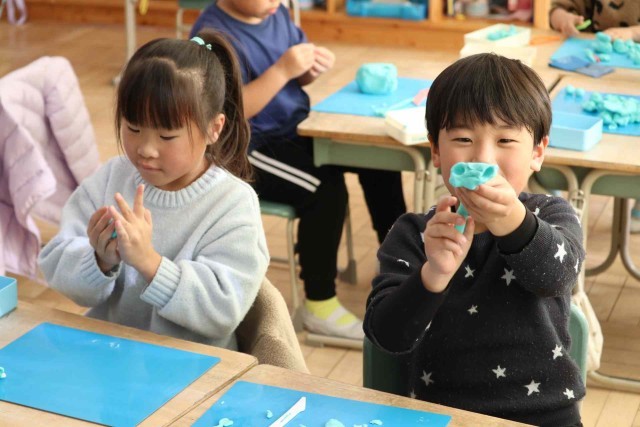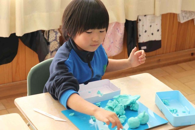 図工の授業で粘土を使った工作をしました。先生が「好きな果物」「好きな動物」のようにお題を出すと、スイカやリンゴ、ヘビや犬などを楽しそうに作っていました。