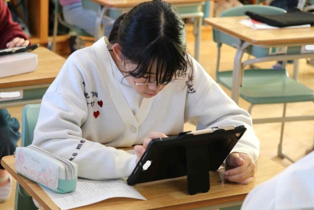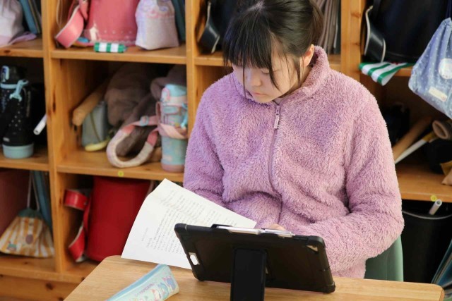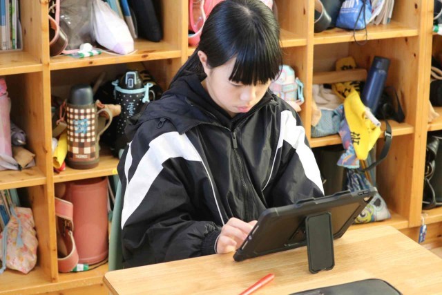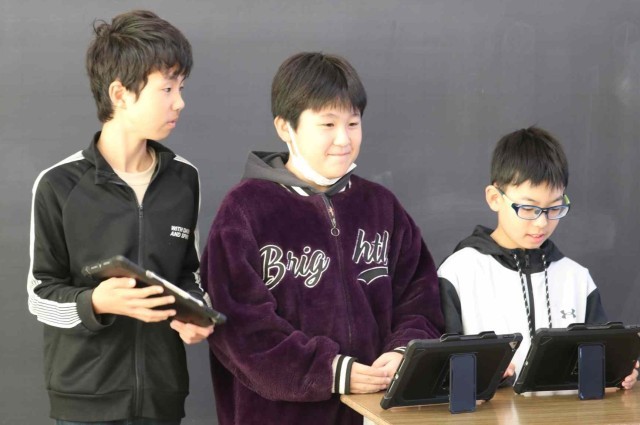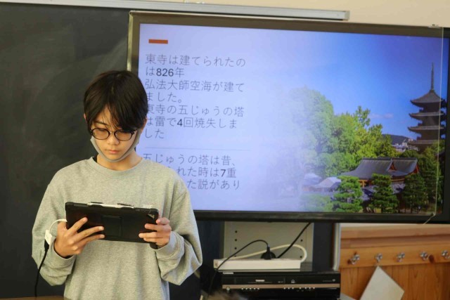 国語の授業でプレゼンテーションの学習をしています。修学旅行の写真や寺院について調べたことなどをプレゼンにしました。今後、後輩たちの教室に出向いて、自分たちが学んだことを発表していきます。