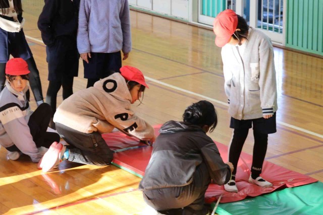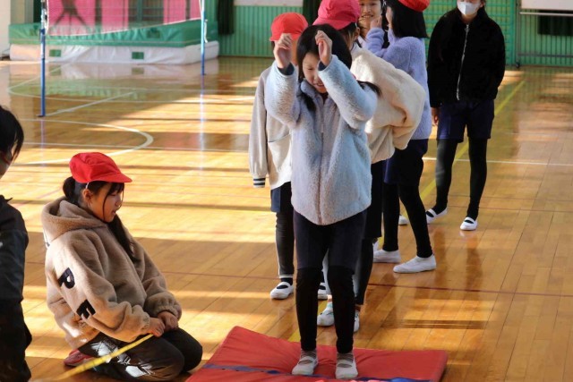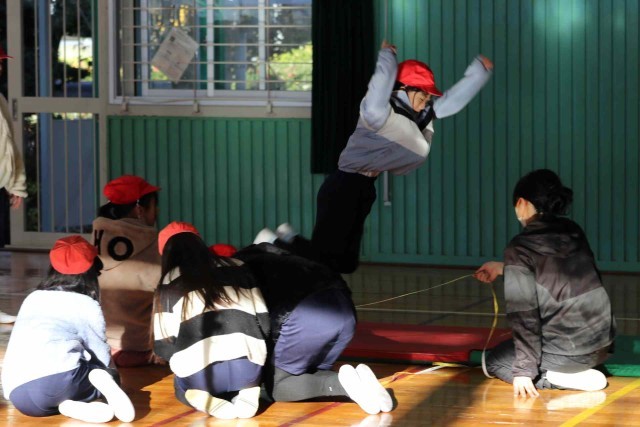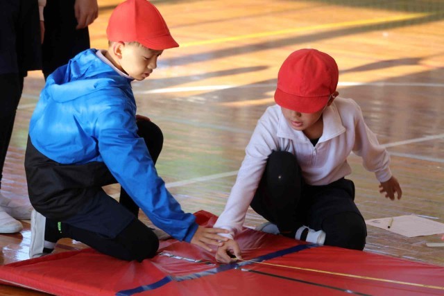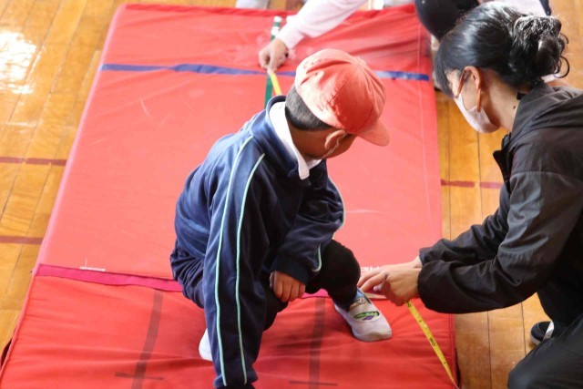体育の授業で立ち幅跳びの計測をしました。以前よりも記録が伸びた子がたくさんいました。計測が終わった子からバレーボールを楽しんでいました。