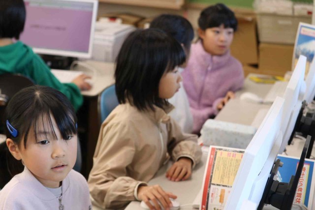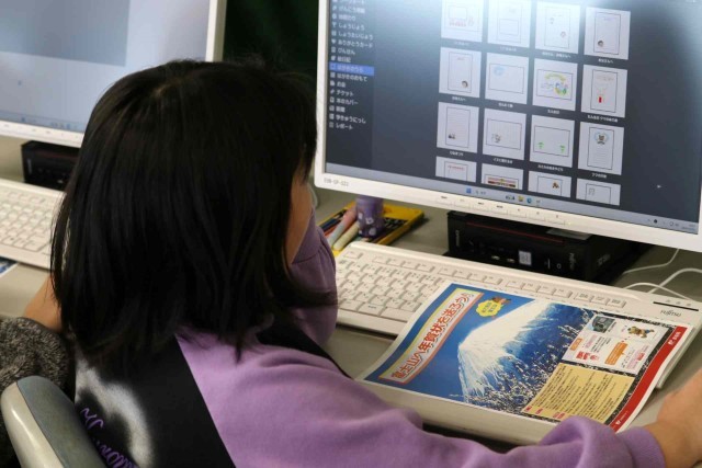学級活動で富士山へ年賀状を出す活動をしました。ワープロソフトを使って年賀状のレイアウトを決め、どんなメッセージやイラストを入れるか考えました。完成した年賀状は富士山山頂の郵便局に届けられます。