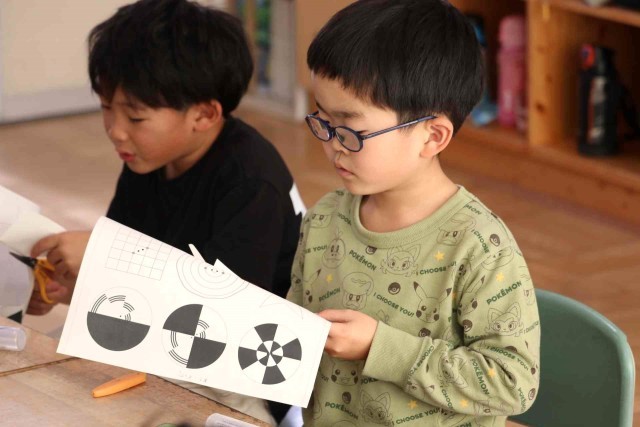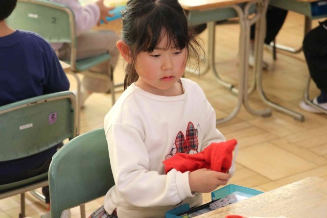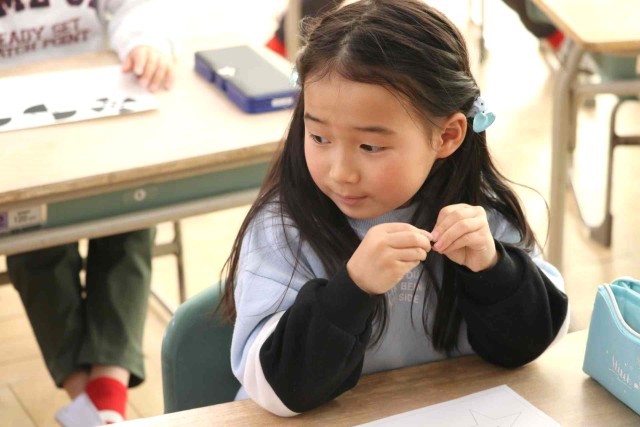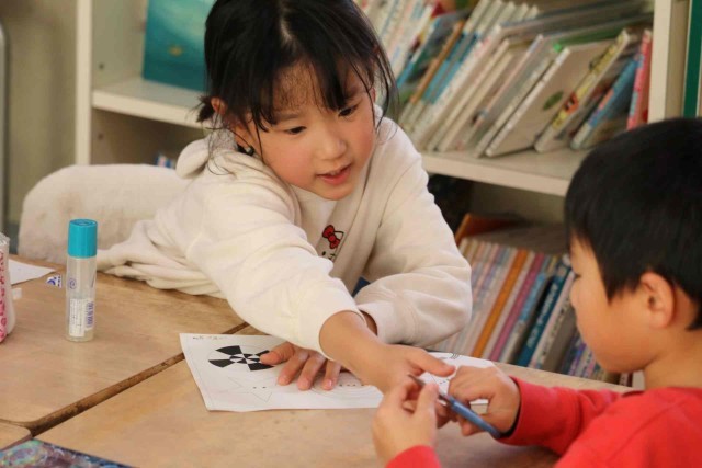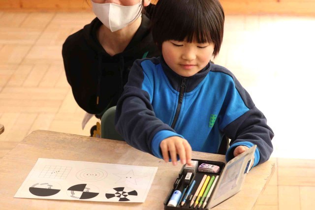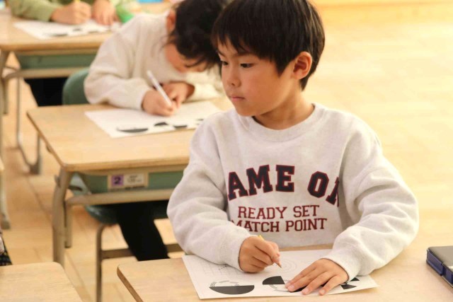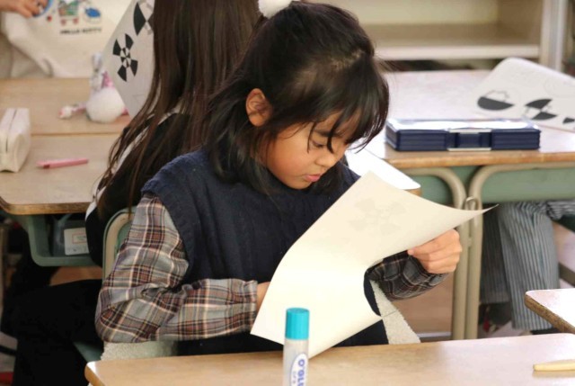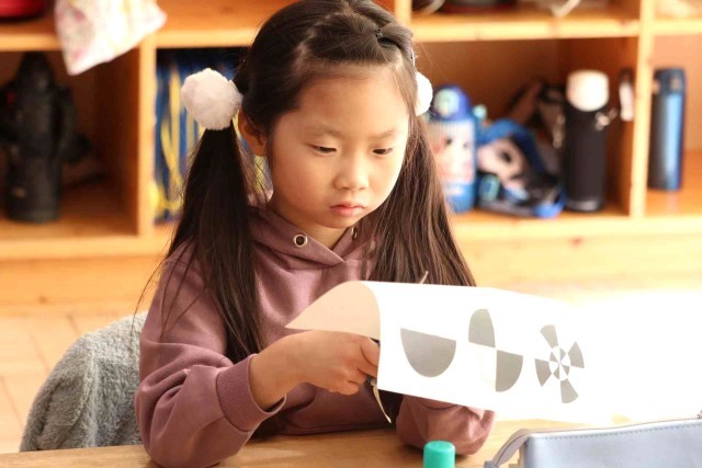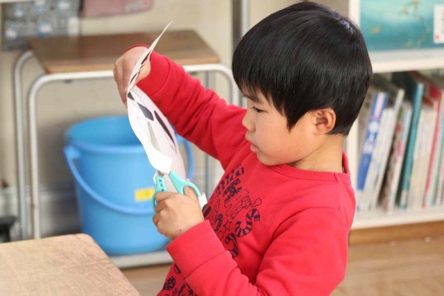 生活科の授業でぶんぶん回るコマを作りました。来月の新入生説明会の日に、保育園や幼稚園の子といっしょに遊ぶ予定です。コマの形にそって、上手にハサミで紙を切ることができました。
