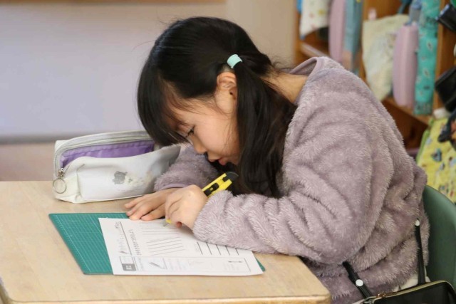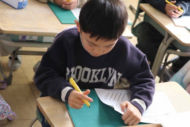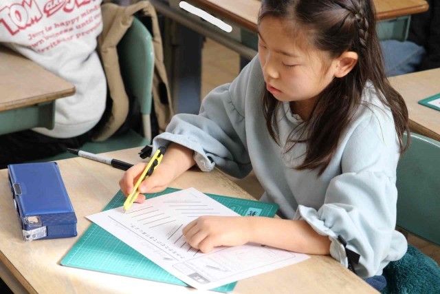 図工の授業でカッターの使い方を学習しました。持ち方や手の位置などを先生に教わってから実際に紙を切ってみました。最初はまっすぐに切るのが難しかったですが、練習して上手にできるようになりました。